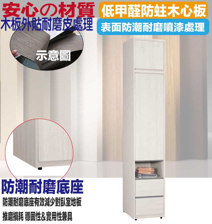 材質:防蛀木心板+防潮耐磨腳座+防夾手緩衝門片五金+五金滑軌結構
