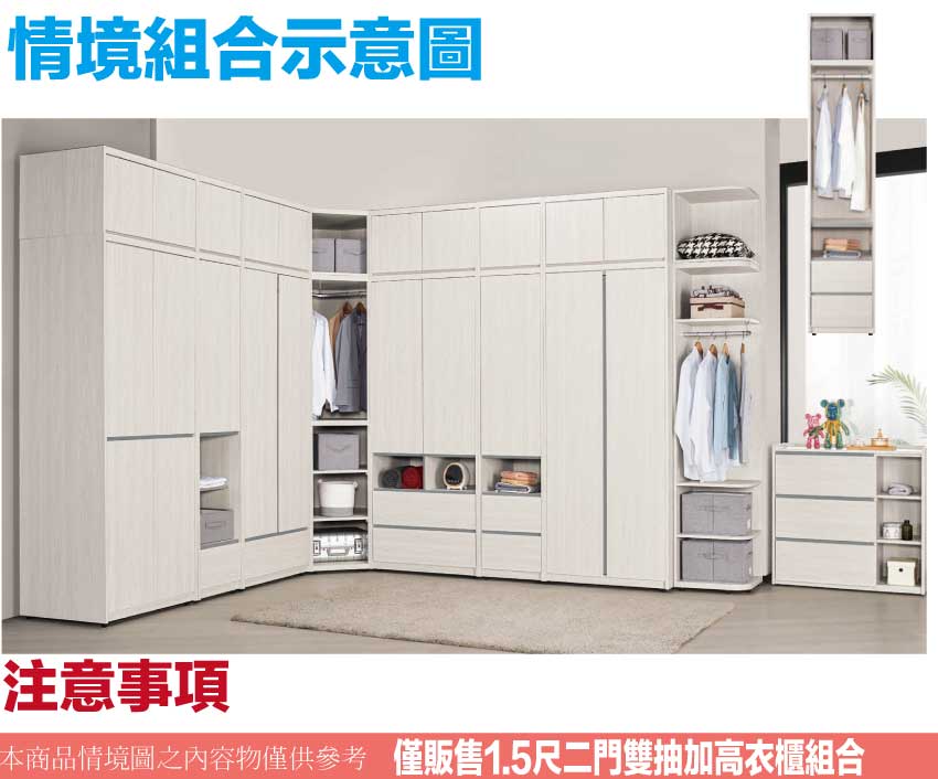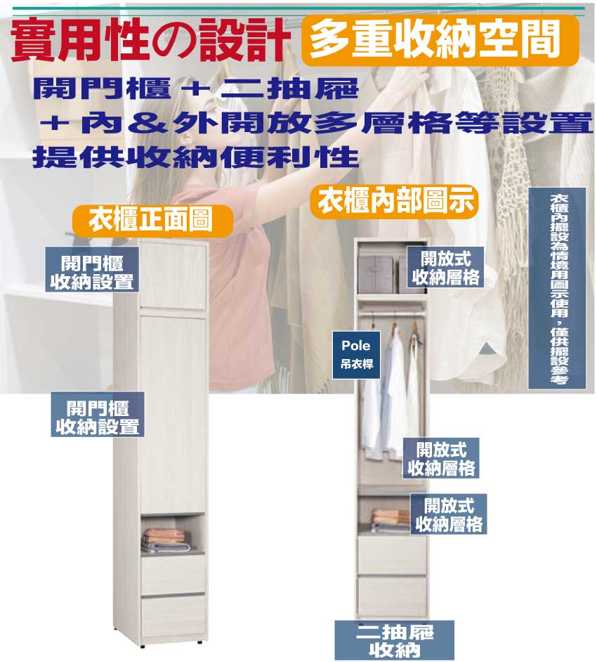 搭配採用開門櫃+吊衣桿+二抽屜+內&外開放層格等收納空間設計