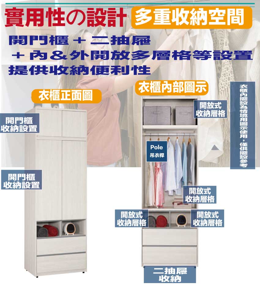 搭配採用開門櫃+吊衣桿+二抽屜+內&外開放層格等收納空間設計