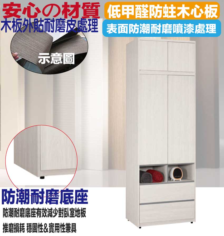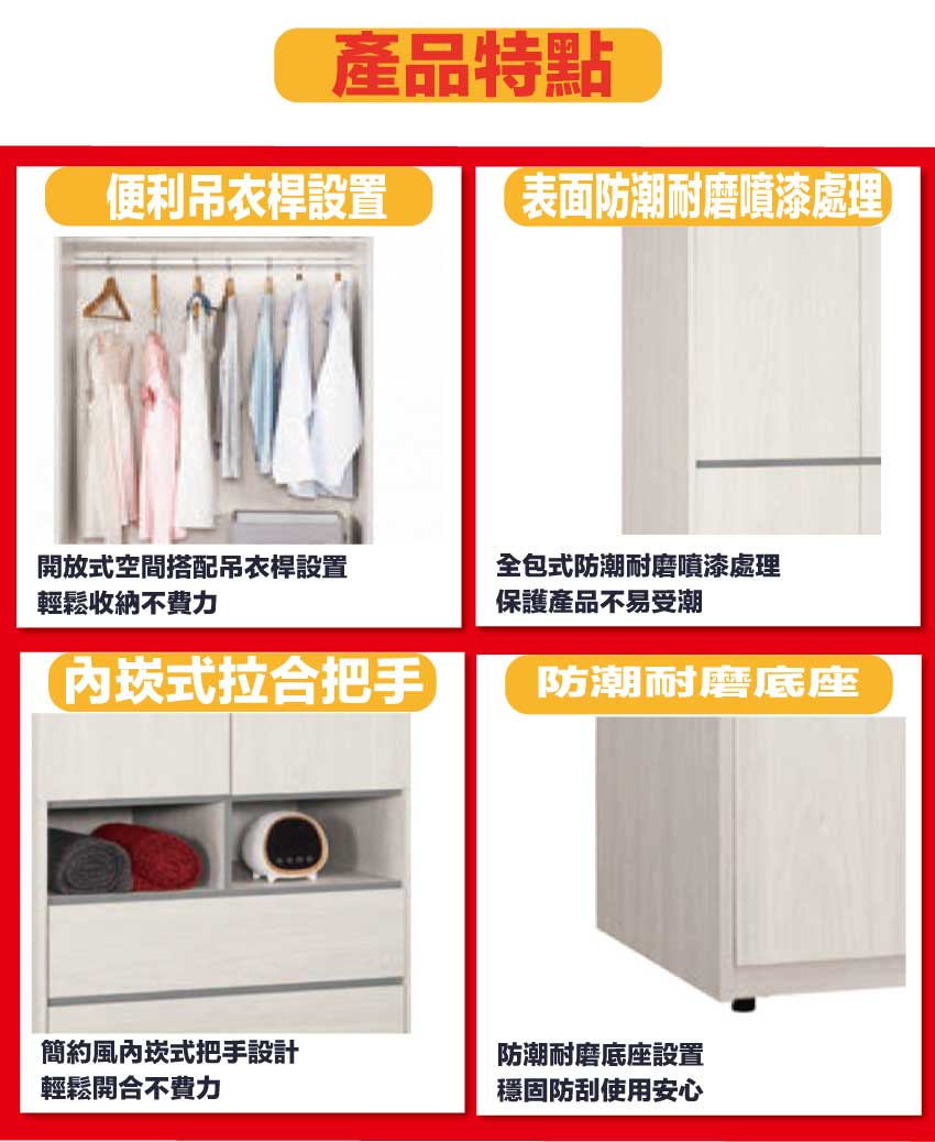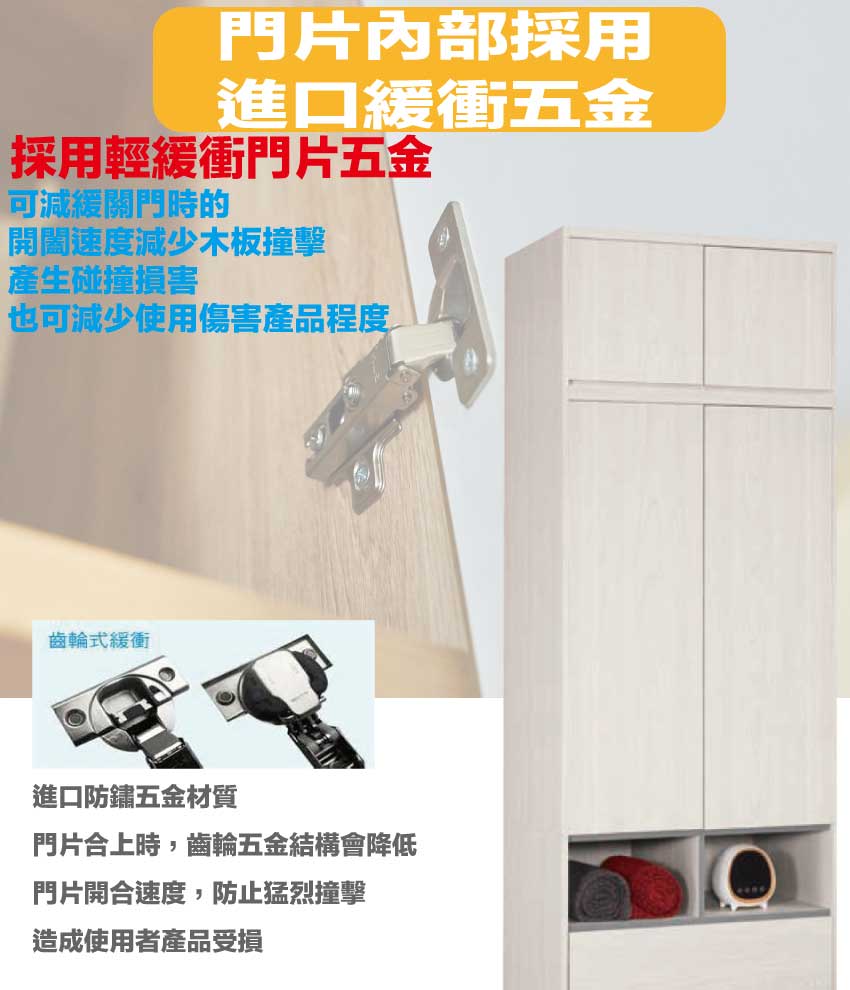材質:防蛀木心板+防潮耐磨腳座+防夾手緩衝門片五金+五金滑軌結構