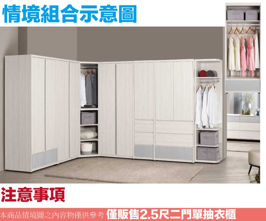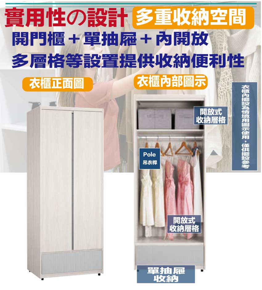 搭配採用開門櫃+吊衣桿+單抽屜+內開放層格等收納空間設計