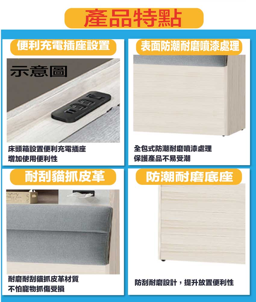【文創集】艾蘿6尺雙人加大貓抓皮四抽床台組合(床頭箱+四抽床底+不含床墊) 淺橡木紋色系+安心材質製造,使用放心+搭配居家更便利,採用防蛀木心板+六分木床板+防潮耐磨底座+耐刮貓抓皮革+高回彈泡棉等安心材質製造 ,外層採用防潮耐磨噴漆處理搭配床頭箱採用可掀式床枕板+內&外開放式層格+便利插座設置加上床底採用雙邊開合四抽屜等收納空間設計,全由專人配送到家,專業安心服務,替你省下更多時間!