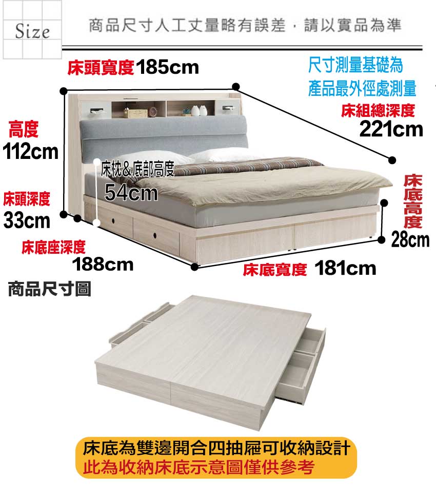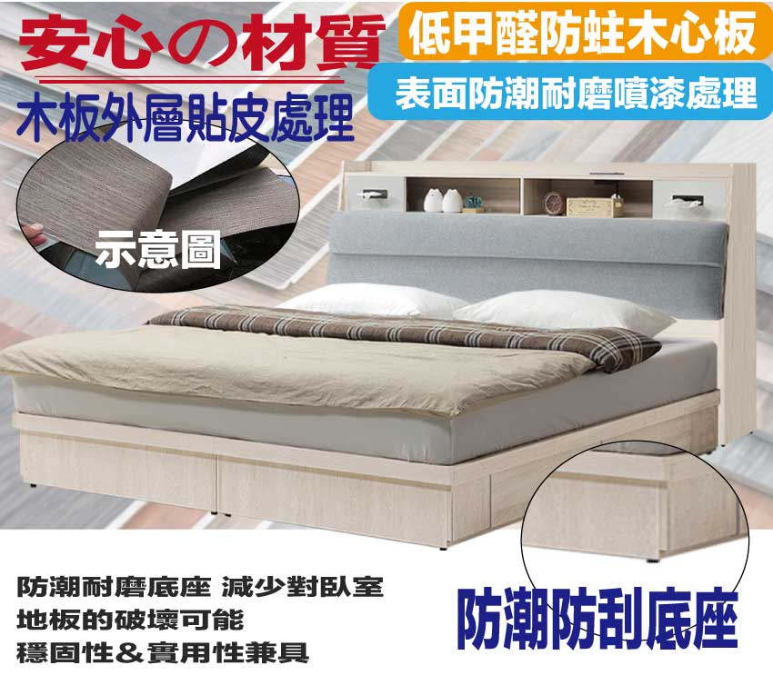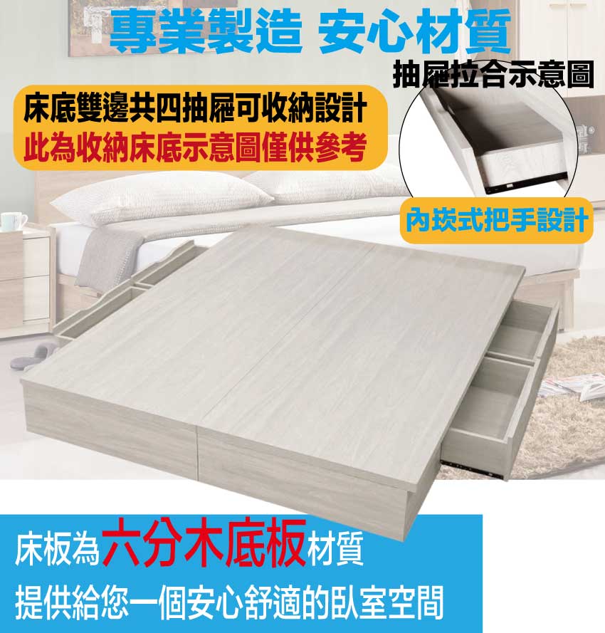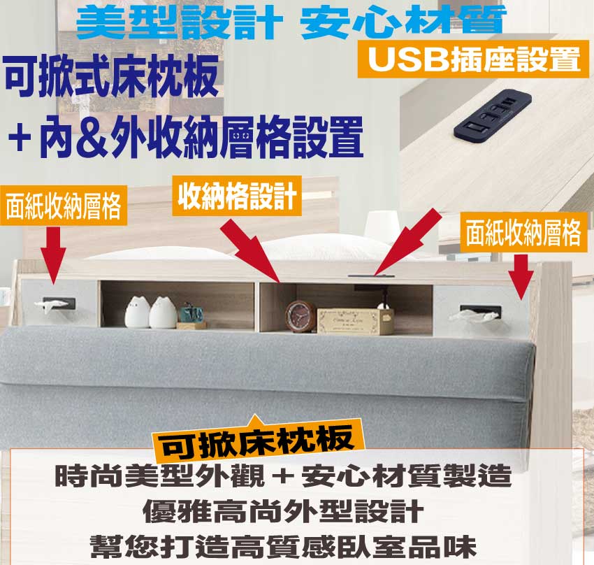 搭配床頭箱採用可掀式床枕板+內&外開放式層格+便利插座設置加上床底採用雙邊開合四抽屜等收納空間設計
