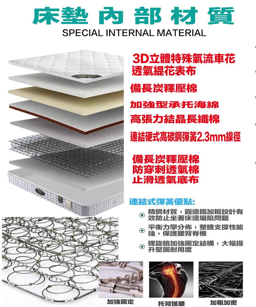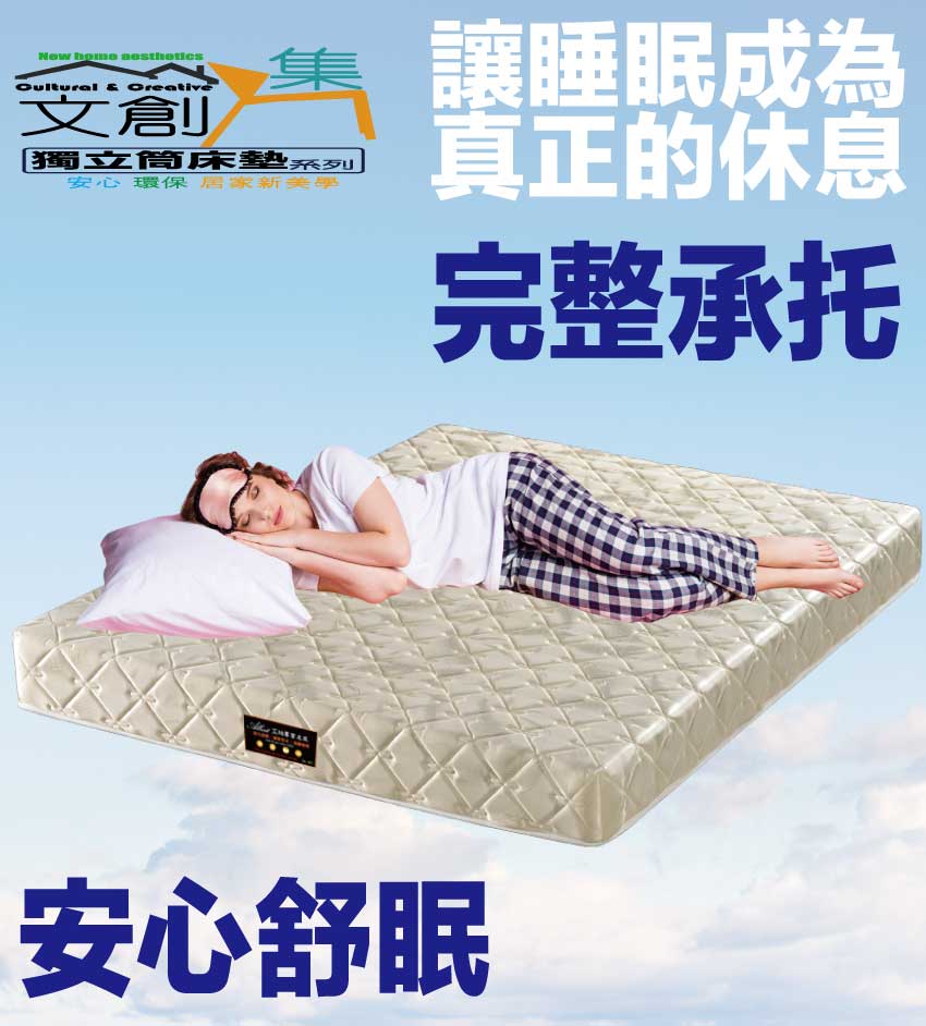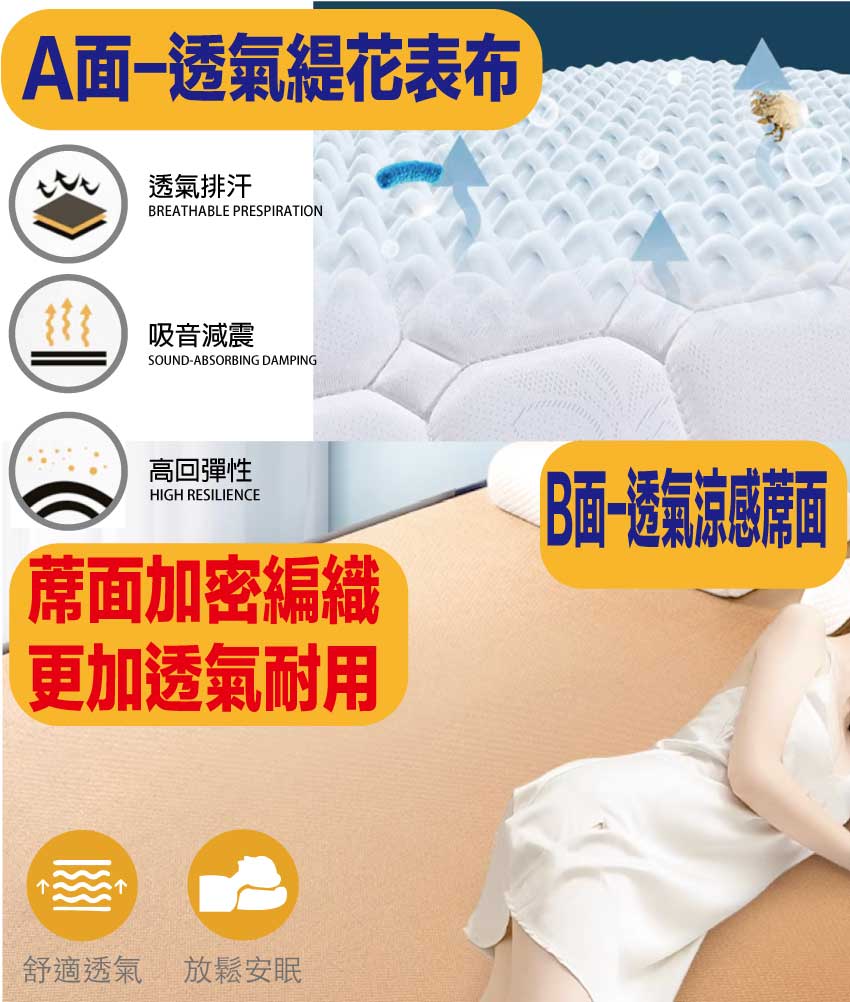 【文創集-床墊系列】5尺雙面防蟎緹花布&蓆面雙人彈簧床墊◆商品尺寸:(寬)150x (深)188 x (高)19公分◆商品材質:(A面)透氣緹花表布+(B面)透氣涼感蓆面+防穿刺透氣棉+止滑透氣底布 +加強型承托海綿+高張力結晶長織棉+備長碳釋壓棉+特殊氣流車花+連結硬式高碳鋼2.3mm線徑靜音抗擾中鋼彈簧◆商品保固:中鋼彈簧體保固5年(正常使用),保用10年本產品款式共有單人加大(105cm)&雙人(150cm)&雙人加大(180cm)等三種尺寸可供您選擇,請先確定床台的尺寸再購買