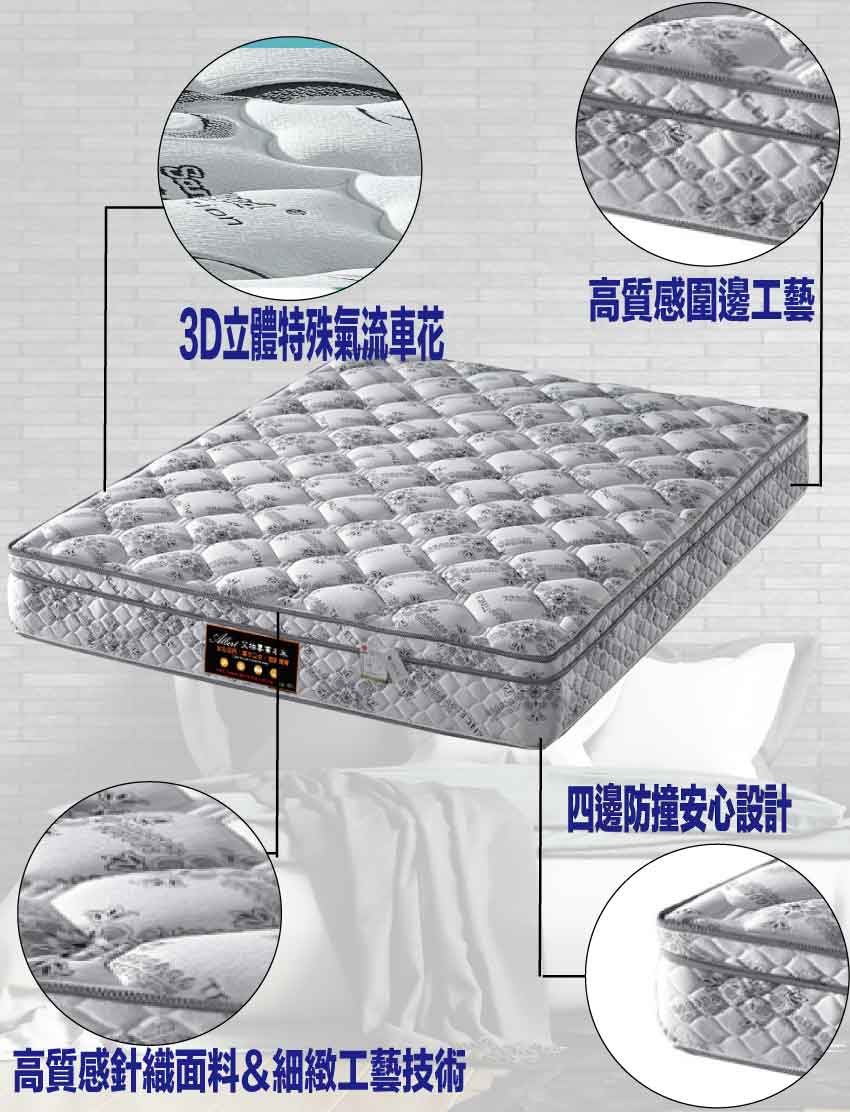 【文創集-床墊系列】抗菌天絲6尺雙人加大聯結式彈簧床墊◆商品尺寸:(寬)180x (深)188 x (高)26/公分◆商品材質:3D立體氣流車花+透氣緹花表布+瑞士Sanitized抗菌處理技術+防穿刺透氣棉+止滑透氣底布 +加強型承托海綿+高張力結晶長織棉+備長碳釋壓棉+連結硬式高碳鋼2.3mm線徑靜音抗擾中鋼彈簧◆商品保固:中鋼彈簧體保固5年(正常使用),保用10年本產品款式共有單人加大(105cm)&雙人(150cm)&雙人加大(180cm)等三種尺寸可供您選擇,請先確定床台的尺寸再購買