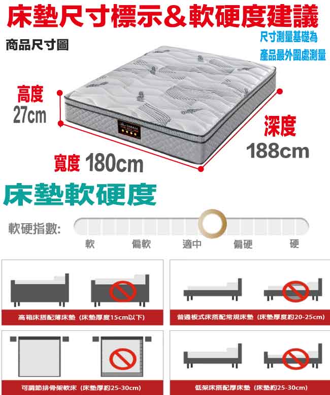 【文創集-床墊系列】3D涼感抑菌6尺雙人加大獨立筒床墊◆商品尺寸:(寬)180x (深)188 x (高)27/公分◆商品材質:涼感紗表布+瑞士Sanitized抗菌處理技術+M字型邊框加強支撐輔助結構+防穿刺透氣棉+加強型承托海綿+高張力結晶長織棉+3D立體特殊氣流車花+備長碳釋壓棉+高碳鋼835顆2.4mm靜音抗擾中鋼彈簧(袋裝獨立筒彈簧)+3D止滑&防潑水表布◆商品保固:中鋼彈簧體保固5年(正常使用),保用10年本產品款式共有單人加大(105cm)&雙人(150cm)&雙人加大(180cm)等三種尺寸可供您選擇,請先確定床台的尺寸再購買