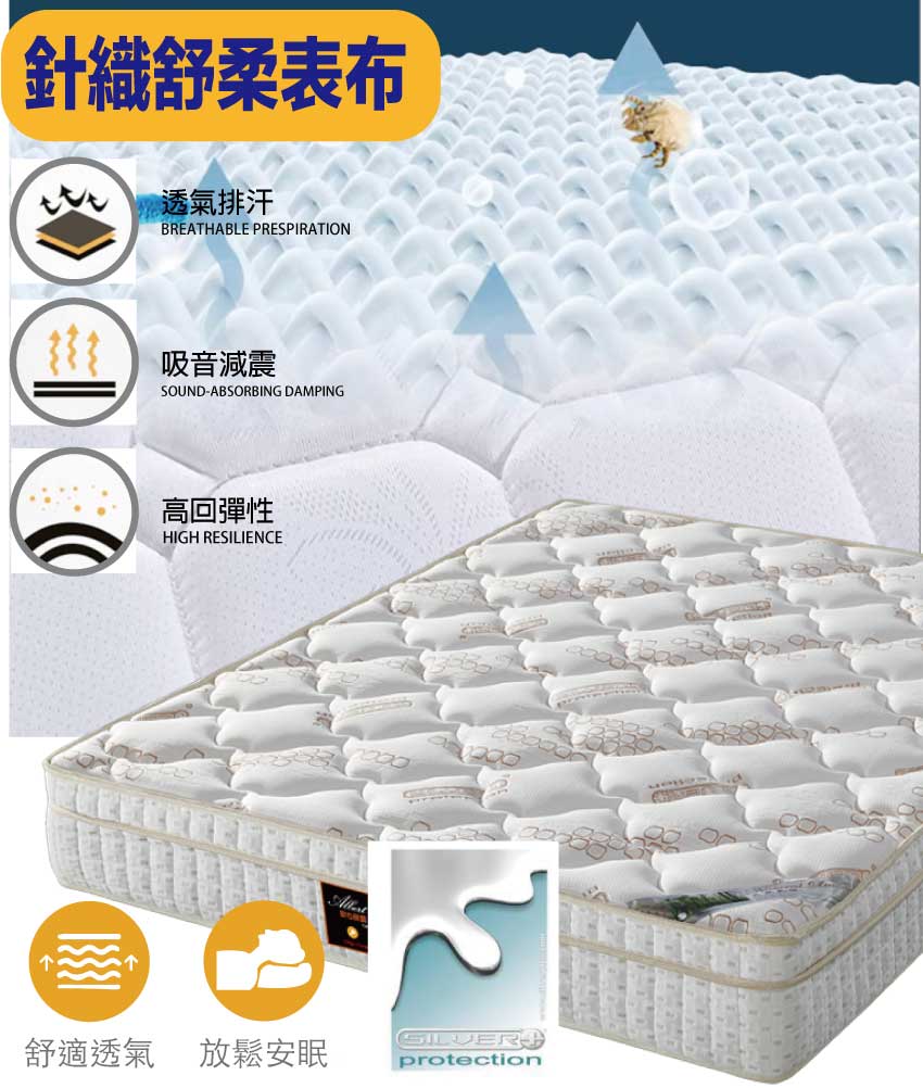 【文創集-床墊系列】抗菌乳膠一線鋼6尺雙人加大彈簧床墊◆商品尺寸:(寬)180x (深)188 x (高)20公分◆商品材質:瑞士Sanitized抗菌處理技術針織舒柔表布+植物性天然乳膠+防穿刺透氣棉+止滑透氣底布+加強形承托海棉+高張力結晶長織棉+備長碳釋壓棉+立體特殊氣流車花+高彈力一線鋼無接縫彈簧+M字型邊框加強支撐結構◆商品保固:中鋼彈簧體保固5年(正常使用),保用10年本產品款式共有單人加大(105cm)&雙人(150cm)&雙人加大(180cm)等三種尺寸可供您選擇,請先確定床台的尺寸再購買