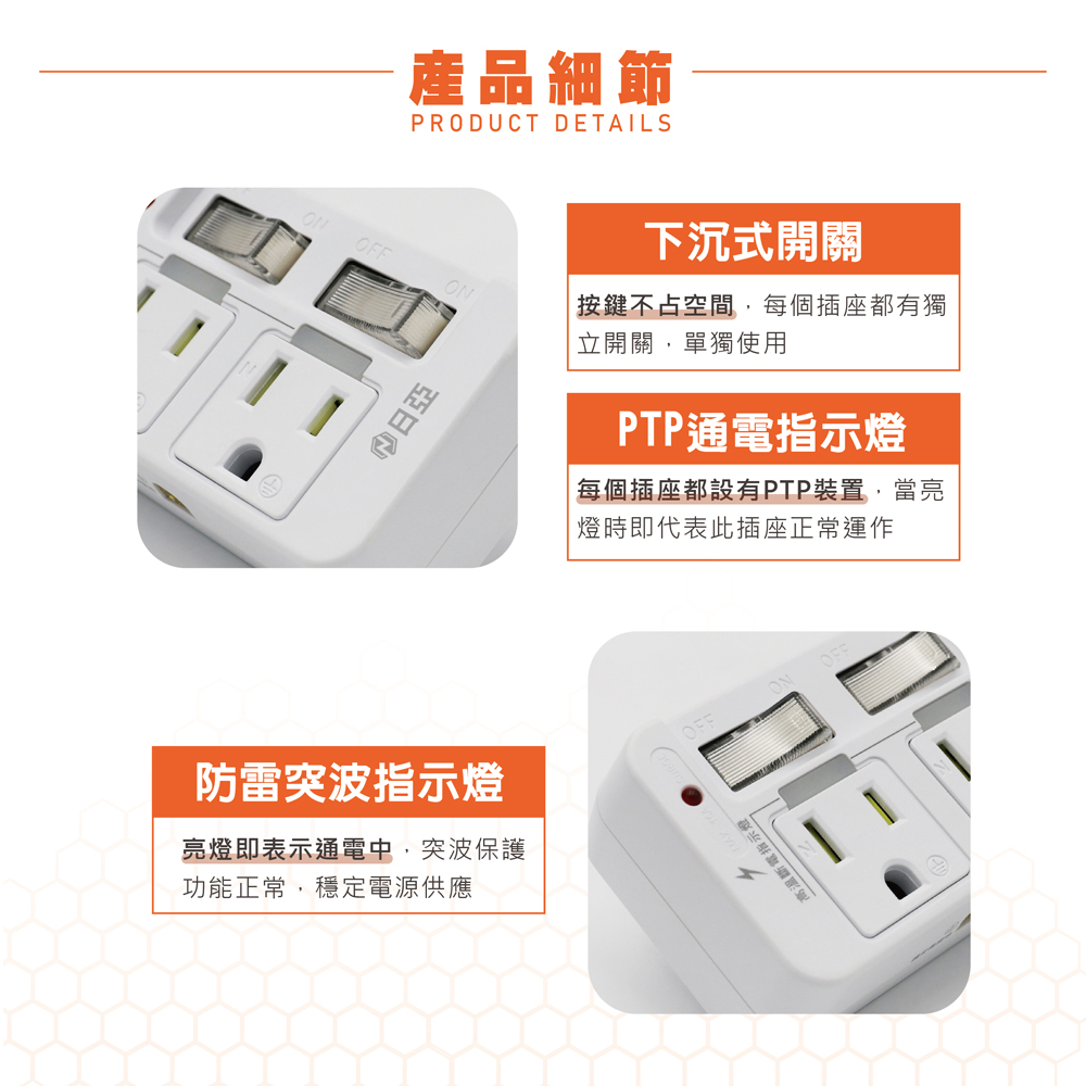 [寶旺旺] 日亞 智慧防雷2孔3插 三面 分接器(新安規 PTP高溫斷電指示燈) R-06L
