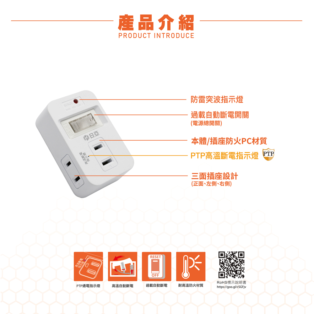[寶旺旺] 日亞 智慧防雷2孔3插 三面 分接器(新安規 PTP高溫斷電指示燈) R-06L