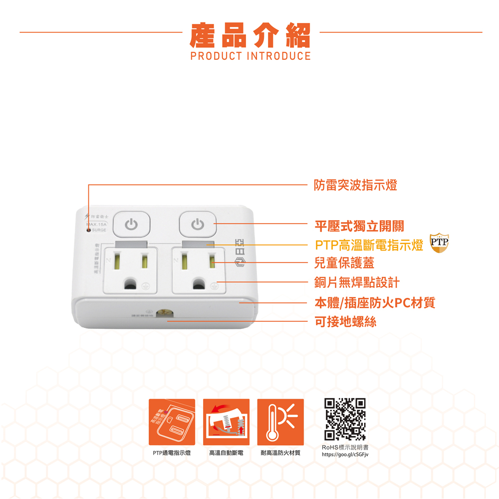 [寶旺旺] 日亞 智慧防雷2孔3插 三面 分接器(新安規 PTP高溫斷電指示燈) R-06L