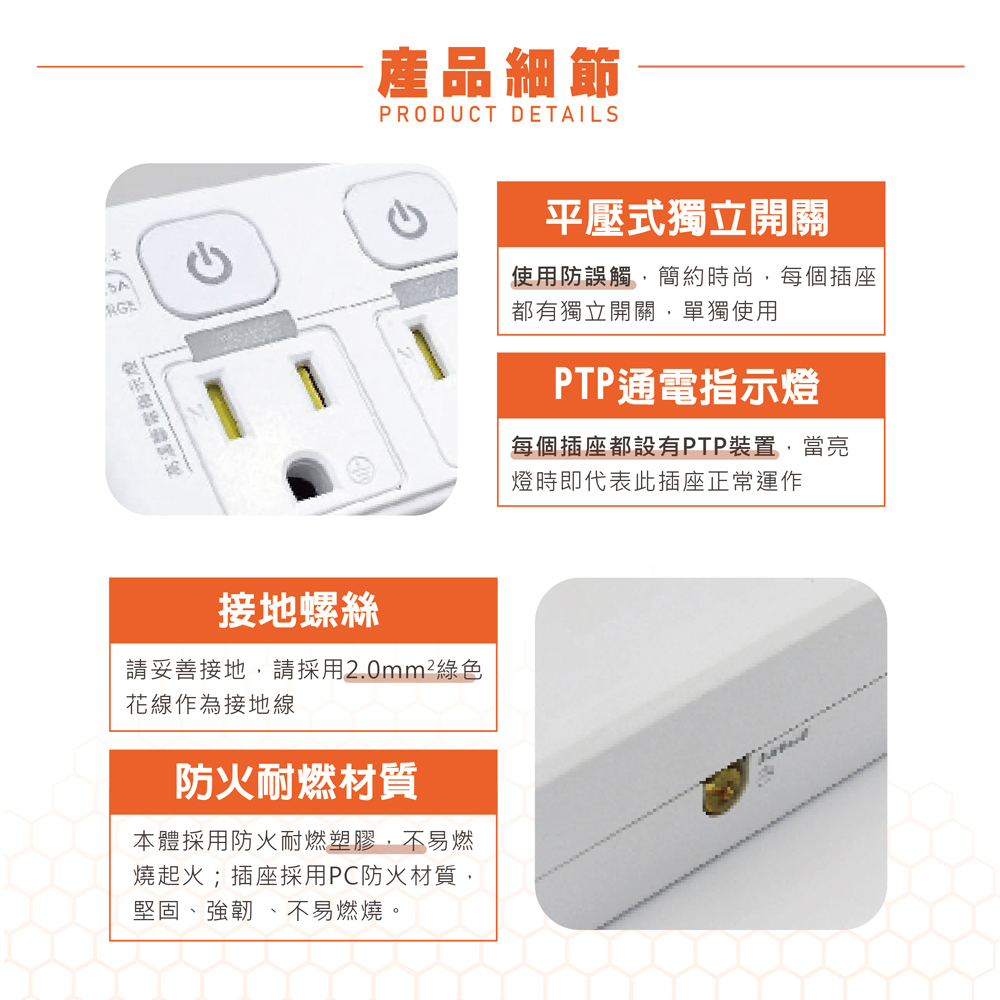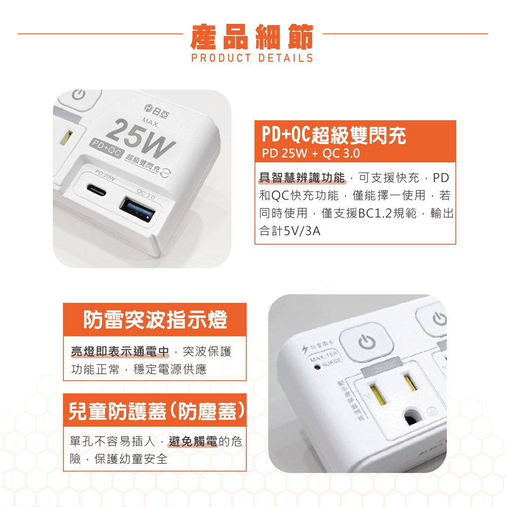 符合BSMI新安規2 USB,智慧辨識PD25W+QC3.0防雷擊突波保護按壓式獨立開關PTP高溫斷電指示燈USB智慧充電孔TYPC PD 25W專用充電插孔兒童保護蓋,防誤觸▼商品規格品名:日亞 按壓式3孔2開2插 2 USB快充PD25W分接器型號:R-71P25LC規格:3孔插2開關2插座2 USB(PD+QC)主要材質:銅、PC塑膠USB額定輸入電流:0.6AUSB輸出總功率:25WUSB輸出:QC TypeA-5V/3.0A、9V/2.77A、12V/2.08A,PD TypeC-5V/3.0A、9V/2.77、12V/2.08A(PD、QC快充功能只能擇一使用,同時使用時輸出合計5V/3A。)(設備本身不具任何充電協議時,TypeA支援DCP DE提供1.5A,TypeC不支援無快充協議充電)額定電壓:AC125V額定電流:15A額定容量:MAX 1650W最大突波吸收能量:25焦耳最大突波吸收電壓:2500V最大突波吸收電流:1200A製造日期:標示於包裝上產地:中國(台商製造,日本品質)保存期限:常溫保存10年驗證登錄:R64847 RoHS保固:新品瑕疵保固 ※使用前請先詳閱包裝上使用說明※圖片僅供參考,商品依實際供貨為準。※商品如有顏色區別,未特別說明則採隨機出貨,不供挑色。※商品如經拆封、使用、或拆解以致缺乏完整性及失去再販售價值時,恕無法退(換)貨!※產品文案為原廠(供應商)所提供,若有變動敬請參照實際商品為準。※請勿盜用圖片進行商業用途,違者必究