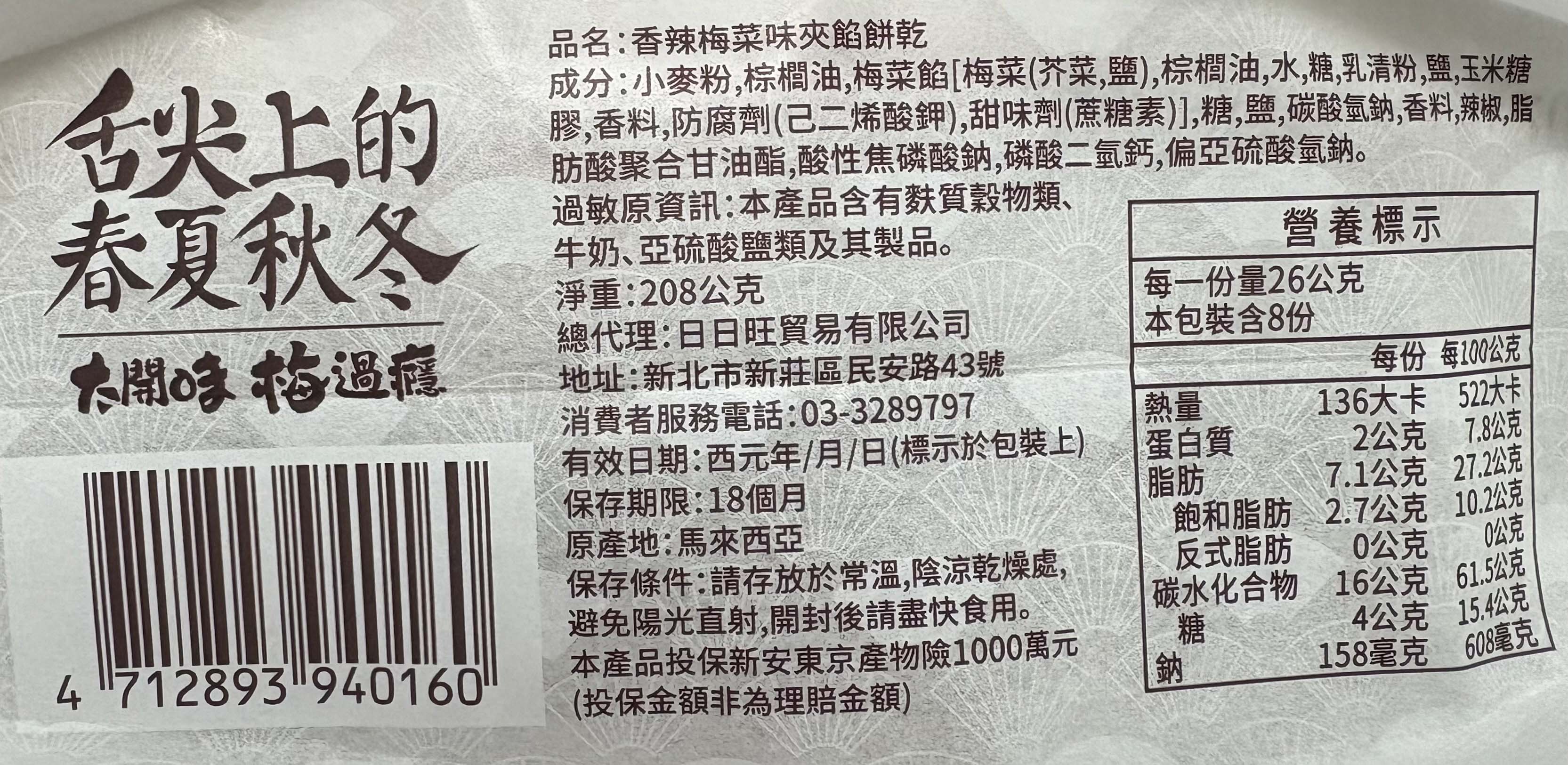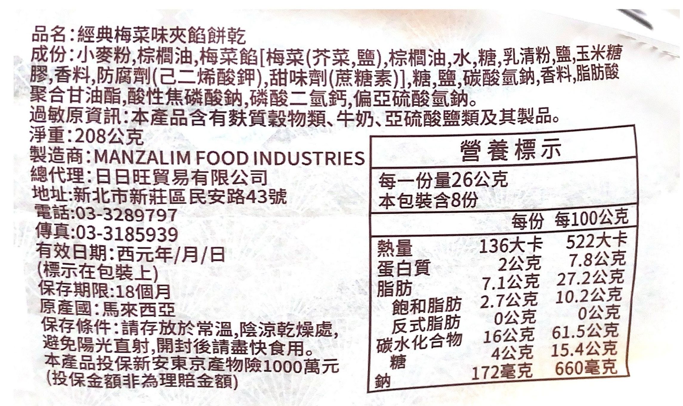 中秋賞月茶食 中秋伴手禮 中秋烤肉聚餐零食 梅菜味夾餡餅乾(奶素) 經典.香辣口味任選 [3包免運組]