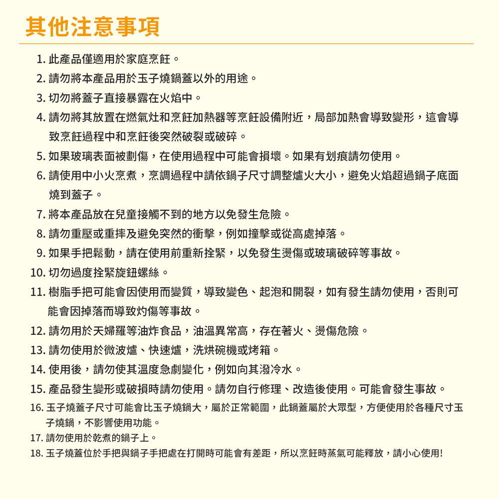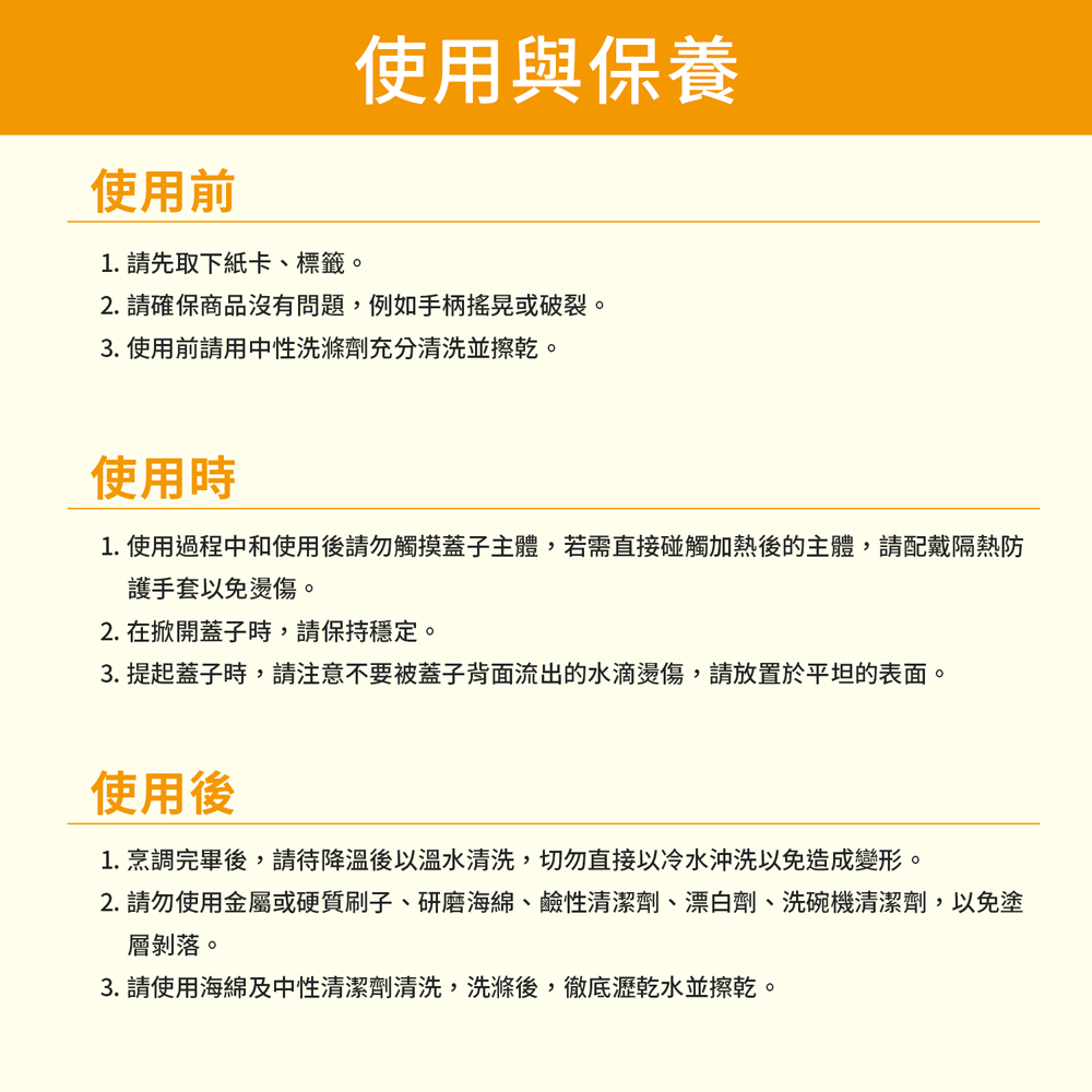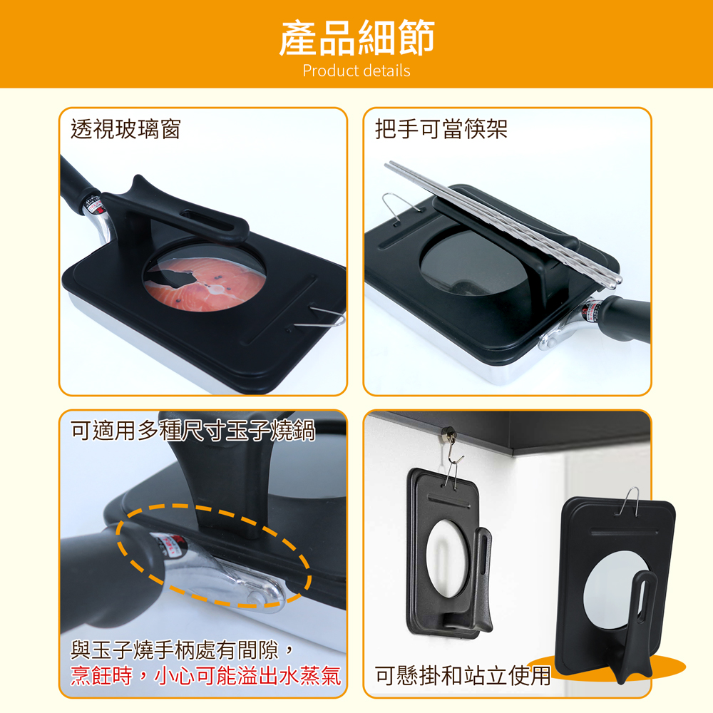 輕量化金屬鋁製,使用無負擔 透視玻璃窗,免掀蓋掌握料理 塗層加工,容易清除污垢 可懸掛和站立使用 把手可當筷架,烹飪更便利 大眾款尺寸設計,可通用多種尺寸