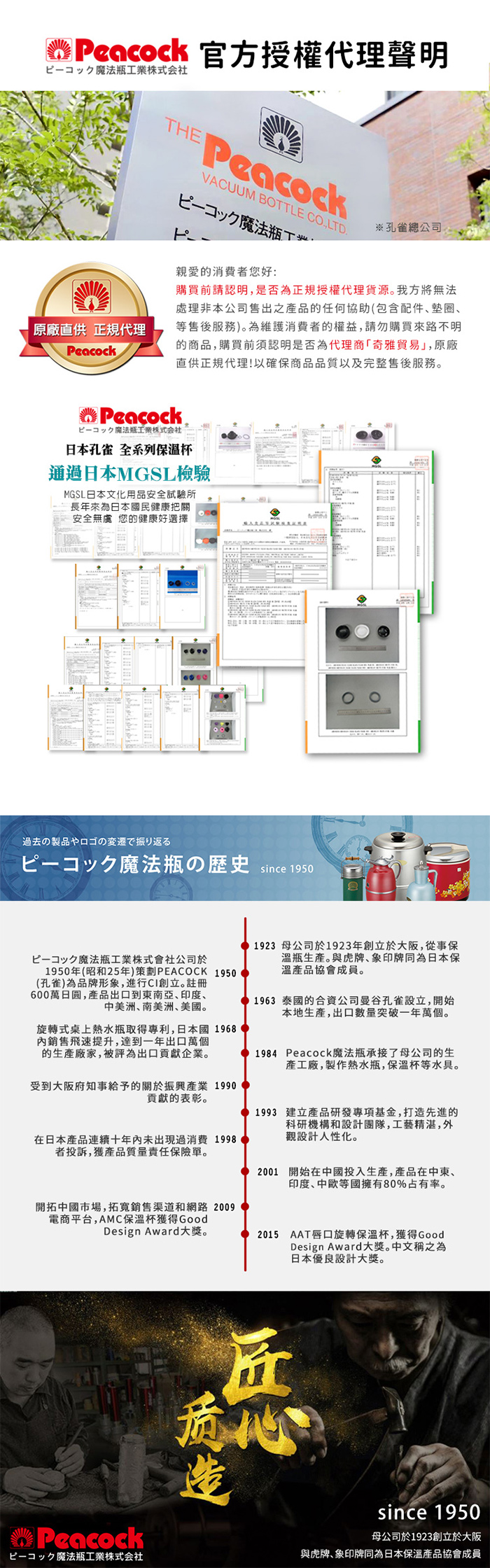 日本孔雀Peacock母公司於1923年創立於大阪,從事保溫瓶生產。與虎牌、象印牌同為日本保溫產品協會成員。日本孔雀,百年的匠心質造,有情懷有態度,成就百年品牌,值得您安心使用。
