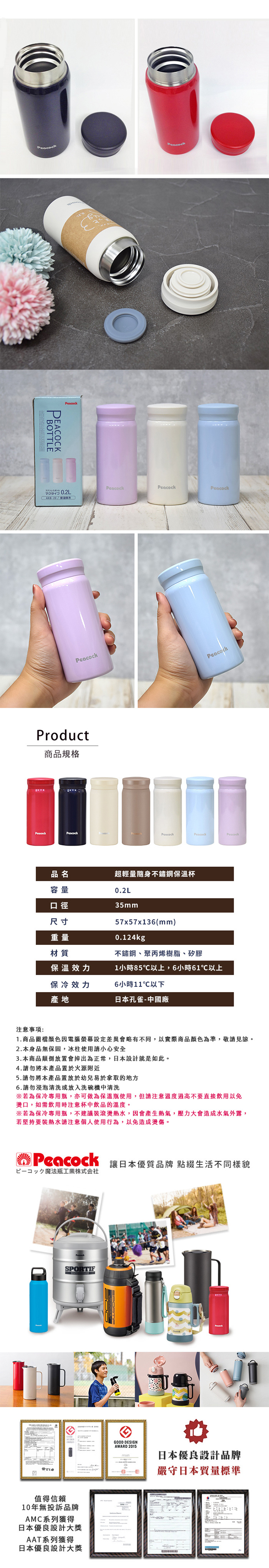 容量:0.2(L)口徑:35(mm)商品尺寸:約57x57x136(mm)包裝尺寸:約62x62x145(mm)重量:本體約0.124(kg)、含包裝約0.154(kg)材質:內瓶-不鏽鋼SUS304 外瓶-不鏽鋼SUS304 (丙烯樹脂噴塗) 瓶口-不鏽鋼 SUS304 上蓋-聚丙烯樹脂 密封圈-矽膠保溫效力:1小時85℃以上,6小時61℃以上保冷效力:6小時11℃以下產地:日本孔雀-中國廠