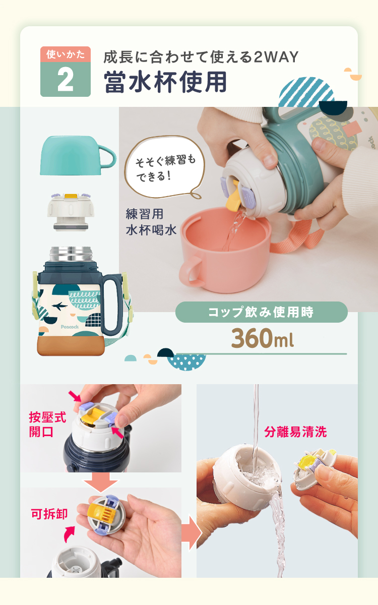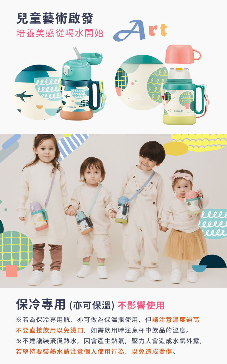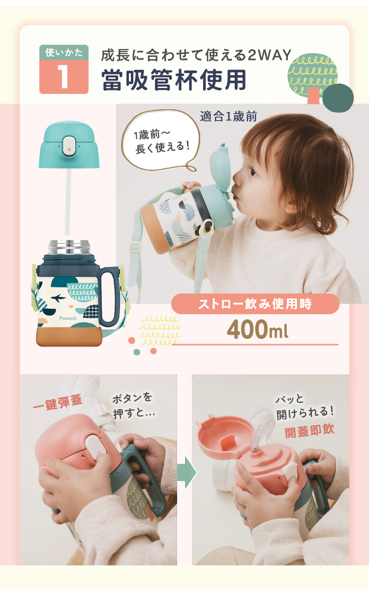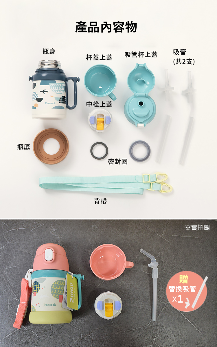 【日本孔雀Peacock】耐衝擊底座 水杯+吸管兩用 兒童不鏽鋼保溫杯水壺400ML(握把+背帶)