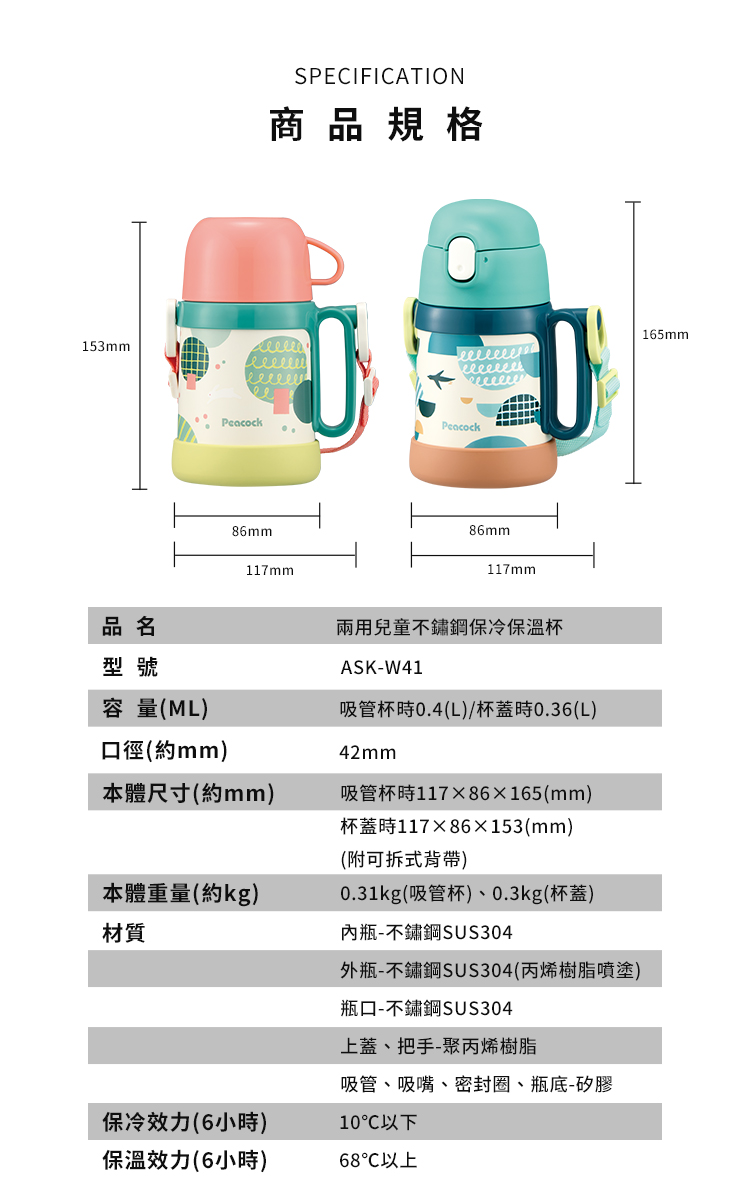 容量:吸管杯時0.4(L)/杯蓋時0.36(L)口徑:42(mm)尺寸:吸管杯時117×86×165(mm)、杯蓋時117×86×153(mm)(附可拆式背帶)包裝尺寸:約98x102x232(mm)重量:約0.31kg(吸管杯)、約0.3kg(杯蓋)含包裝重量:約0.47kg材質:內瓶-不鏽鋼SUS304 外瓶-不鏽鋼SUS304(丙烯樹脂噴塗) 瓶口-不鏽鋼SUS304 上蓋、把手-聚丙烯樹脂 吸管、吸嘴、密封圈、瓶底-矽膠保冷效力:6小時10℃以下保溫效力:6小時68℃以上產地:日本孔雀-中國廠
