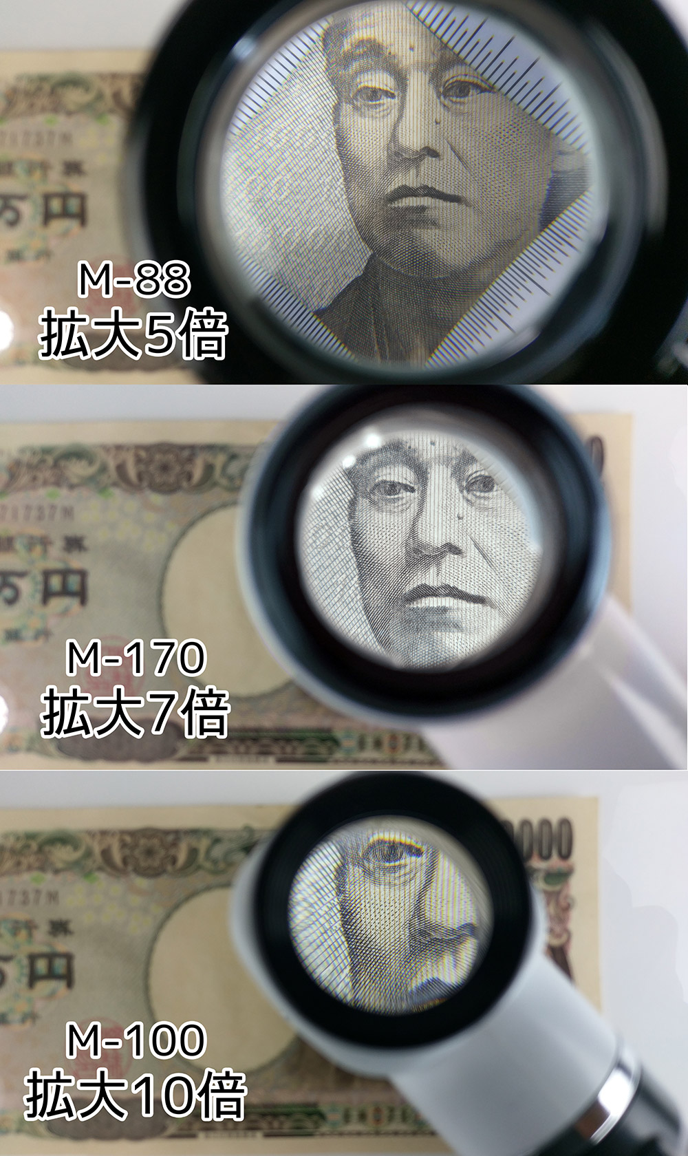 日本池田生產的 M 系列手持型照明放大鏡,提供不同的倍率與功能,以滿足各種使用者的需求:.M-100、M-170 屬於高倍率立式放大鏡,具有刻度板,可應用於檢驗工作、簡易量測等用途。.M-323 屬於低倍率立式放大鏡,80mm 大鏡面,視野寬廣,看到哪移到哪,適合銀髮族長時間閱讀,也適用於昆蟲觀察。.M-88 屬於高倍率立式放大鏡,具有刻度版,半開口式工作窗,可將鑷子伸入,適合低視能患者閱讀,也適用於精密工作。 產品特色高倍單眼觀察設計本產品為高倍放大鏡,使用時將鏡片置於一眼正前方,在適當眼距內觀看可獲得最佳視野與成像效果。適用於弱視、低視能患者、需進行單眼視力訓練的使用者、瑕疵品管等。不適合一般閱讀使用。可拆式量測用刻度板【M-170】量測範圍為 2cm、1 inch,最小量測單位可達 1mm、1/16 inch,欲觀察凹凸不平的物件時,可將刻劃板拆下再進行使用。固定焦距的機身設計本系列放大鏡的頭部已固定焦距,看到哪就移到哪,不需要將手長時間舉起,使用方便。機身採用強度高的 ABS 塑膠材質,質地細緻,觸感舒適好握。LED 白光照明採用 LED 白光燈做為照明光源,具有省電、低溫、高亮度等優點,讓您即使在昏暗環境也能看得清楚。(本產品出貨不附電池)注意事項.鏡片露出時請勿放置於太陽光下,以免造成危險。.規格所述焦距(工作距離)、眼距為實際測試結果,但可能因各人視力狀況不同而略有差異。.擦拭鏡面時,應先以乾淨布由單一方向輕輕擦拭,若畫圈或來回擦拭可能刮傷鏡片。.鏡片為玻璃鏡片,使用時請小心勿摔落,若不慎摔落應以厚報紙包起碎片,以防割傷。.長時間不使用請將電池取出,以避免電池漏液造成損壞。廢電池請回收。 產品規格放大倍率:7倍屈 光 度 :24 Dpt鏡面尺寸:30mm鏡片材質:日本製青板玻璃鏡片方式:兩片分離式照明光源:LED 白光燈量測範圍:2cm / 1 inch最小單位:1mm / 1/16 inch眼 距:30mm使用電池:2號 (C型) 電池*2 (本產品出貨不附電池)尺 寸:長185x寬56x高58mm重 量:94g產 地:日本品牌介紹日本池田最初名為「池田レンズ製作所」,創立於大正12年 (西元1923年),位於大阪市生野區,專注於鏡片生產與加工。昭和37年 (西元1962年) 正式更名「池田レンズ工業株式会社」,專營放大鏡生產與銷售,讓放大鏡不僅是銀髮族的閱讀工具,擁有多款專利之工作用放大鏡、放大眼鏡等,讓民眾工作時能避免過度用眼,提升工作效率。品質優良、選擇多樣、價格實惠,是日本池田製品 的特色。LOUPE STUDIO 是日本池田在日本國內的網購店鋪名,熱銷全日本。華堂光學實業是日本池田的台灣長期合作夥伴。