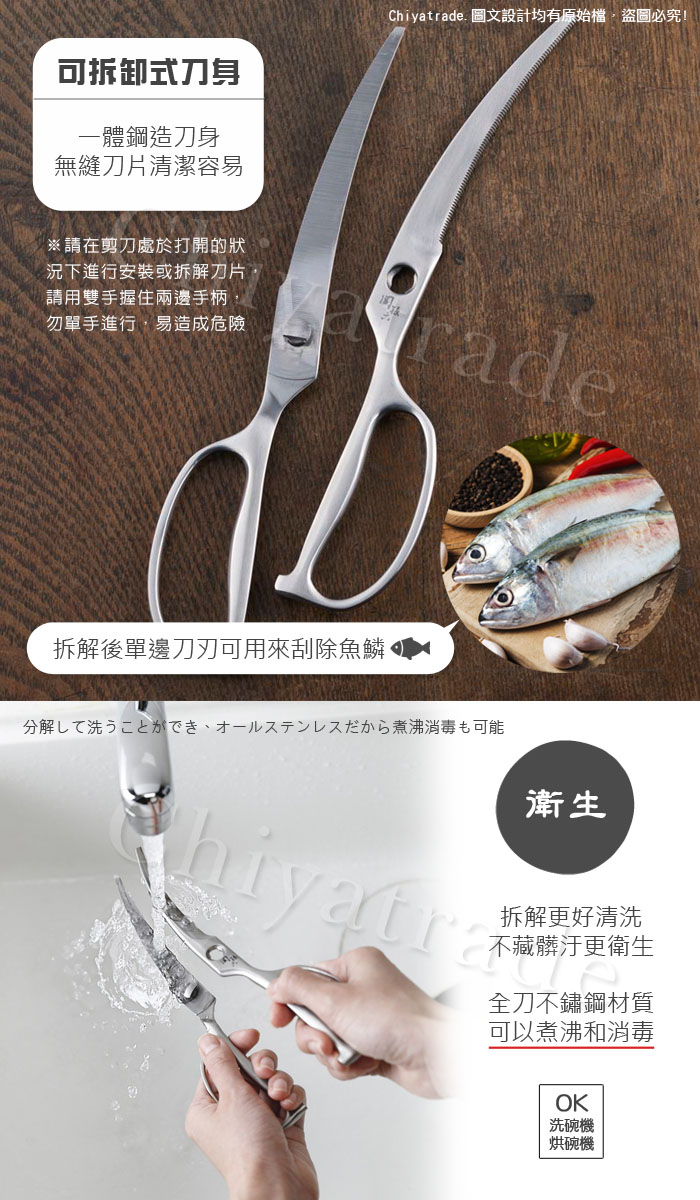 不同於舊式剪刀容易在交縫處藏匿細菌,一體成型單邊刀刃,拆解後好清洗,衛生安全。