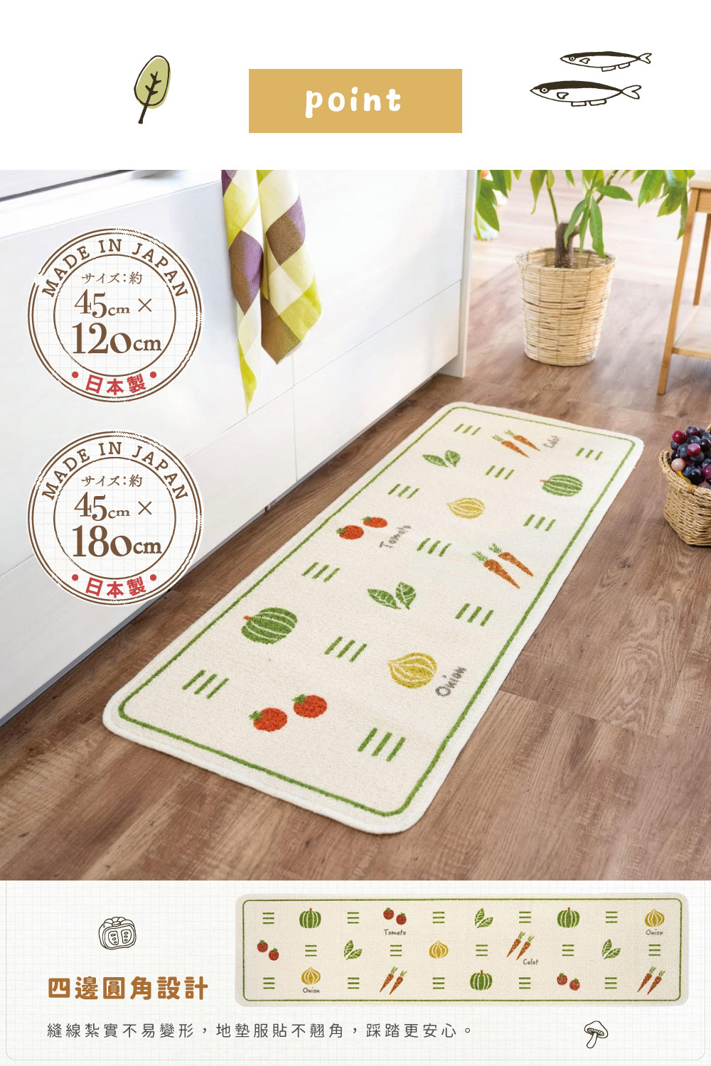 【日本Oka】日本製再生印花廚房地墊45×120cm(野蔬果記款/可機洗/厚4mm)