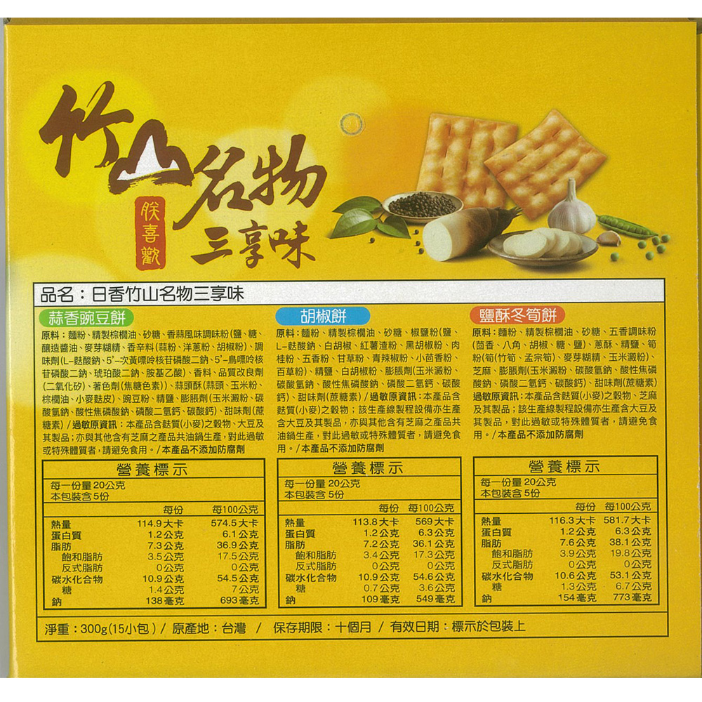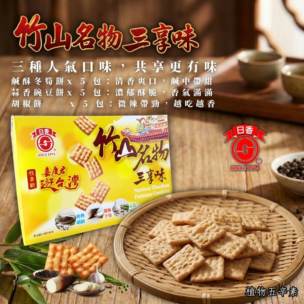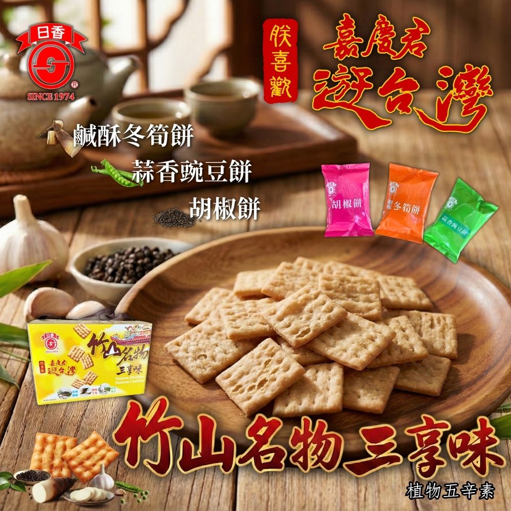 💥今年中元普渡最有看頭的拜拜箱A:竹山名物三享味(15小包入/植物五辛素)內容物:冬筍餅*5包/胡椒餅*5包/蒜香碗豆餅*5包👍南投竹山在地飄香50年的懷舊零食❤50年的老品牌 😋小時候的回憶零嘴,單純的美好味道精選優質原料,獨家傳承香料,香脆可口讓您的舌尖味蕾品嚐獨特的美味👍冬筍餅/胡椒餅/蒜香碗豆餅 三種口味一次享受鹹香鹹香更是百吃不膩,越吃越唰嘴,讚不絕口😋獨立包裝好方便🎁休閒會友,品茶,送禮自用好選擇👍#普渡拜拜絕對不能錯過#中元拜拜首選