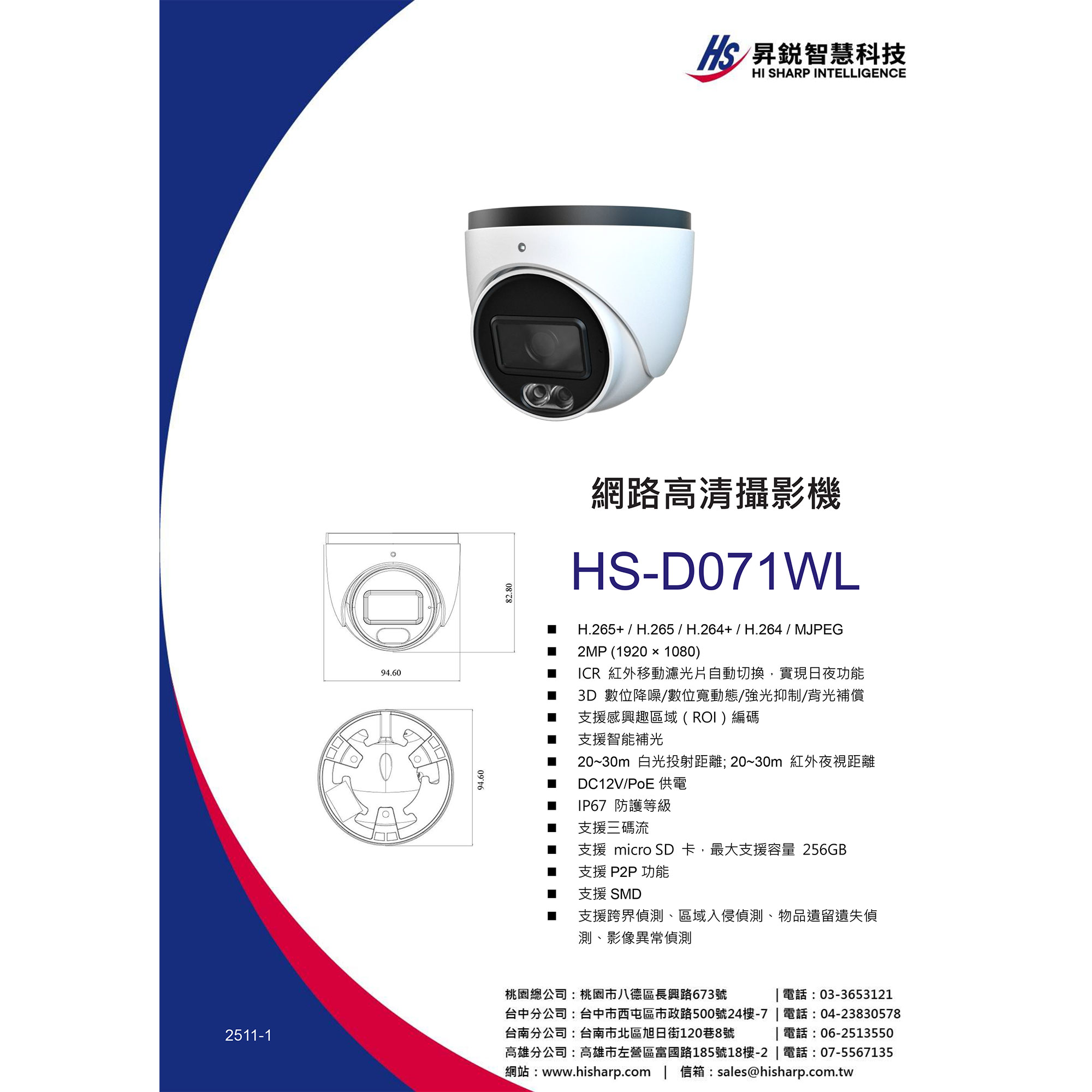 昌運監視器 昇銳 HS-D071WL 200萬畫素 半球型網路攝影機 紅外夜視距離20~30 m 支援PoE供電