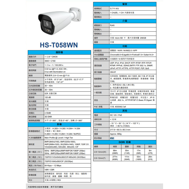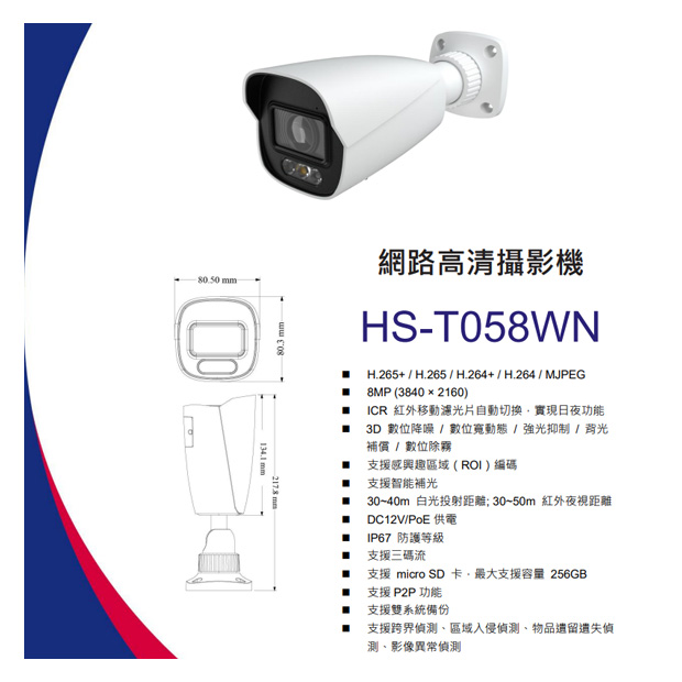 昌運監視器 昇銳 HS-T058WN 8MP 8百萬智能雙光槍型網路攝影機 IP67防護等級