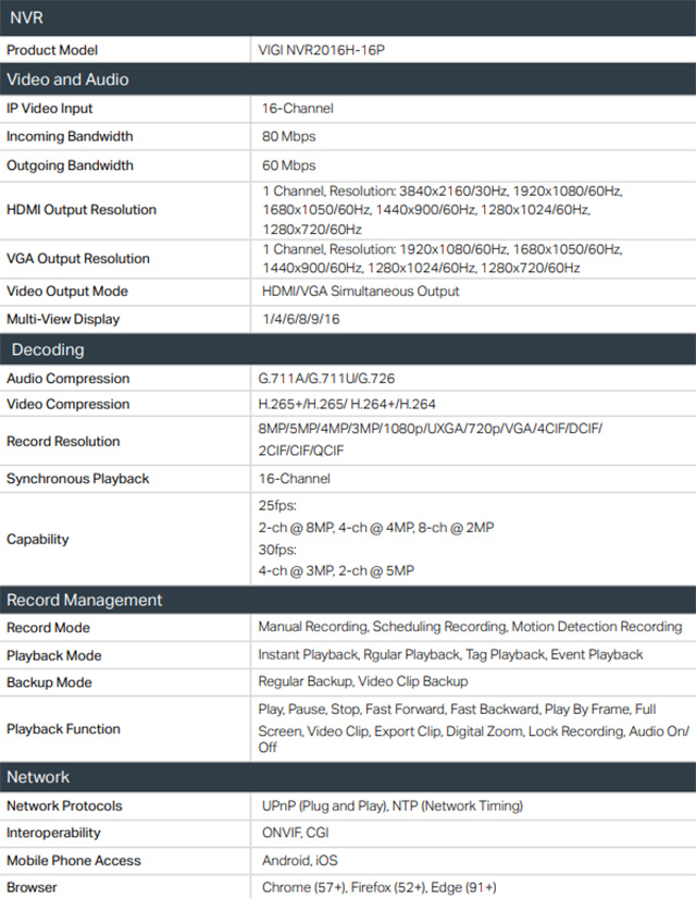 '-4K HDMI 影像輸出及16 MP 解碼能力:提供高達 8 MP 更清晰的影像解析度,以及 8 路 2 MP的解碼能力,讓您可以同時享用更多頻道的即時畫面及回放。 -90 W PoE 供電:16 個 802.3af/at 標準的 PoE+ 連接埠,提供 90W 電力供應。 -16 路同時回放:同時最多可回放 16 台攝影機、增加回放速度並在排程中輕鬆查看影像紀錄。. -H.265+:攝影機可以傳輸壓縮過的超清晰影像,不佔用額外頻寬並節省硬碟空間,減輕網路負載,在減少監控成本的同時不犧牲影響品質。 -ONVIF 相容性:從 VIGI 輕鬆新增所有支援 ONVIF 協定的攝影機,建立強大且多樣的網路影像, -自動初始化以快速設定:只要點擊 "自動初始化" 即可對攝影機及硬碟進行基本設定,大大減少設定時間。 -7 天 24 小時連續錄製:可儲存最多至 20 TB(1048儲存天數***)所有連線攝影機的影像,提供更快、更方便的存取。 -雙向語音:藉由語音對話功能的支援,在任何地方您可逼退潛在的竊賊或入侵者。 -遠端監控:VIGI app 和用戶端工具使遠端監控更容易,提供更多便利性。