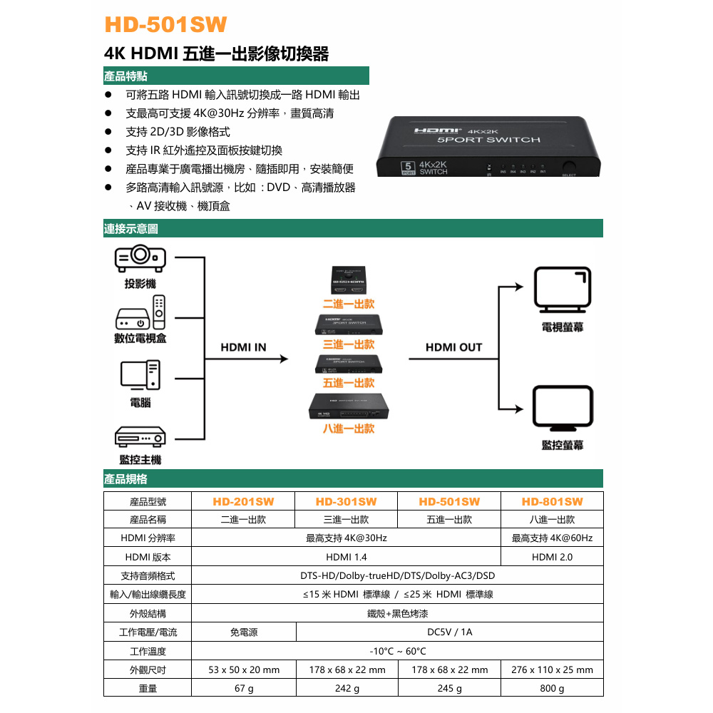 昌運監視器 HD-501SW 4K HDMI五進一出影像切換器 支援4K@30Hz分辨率