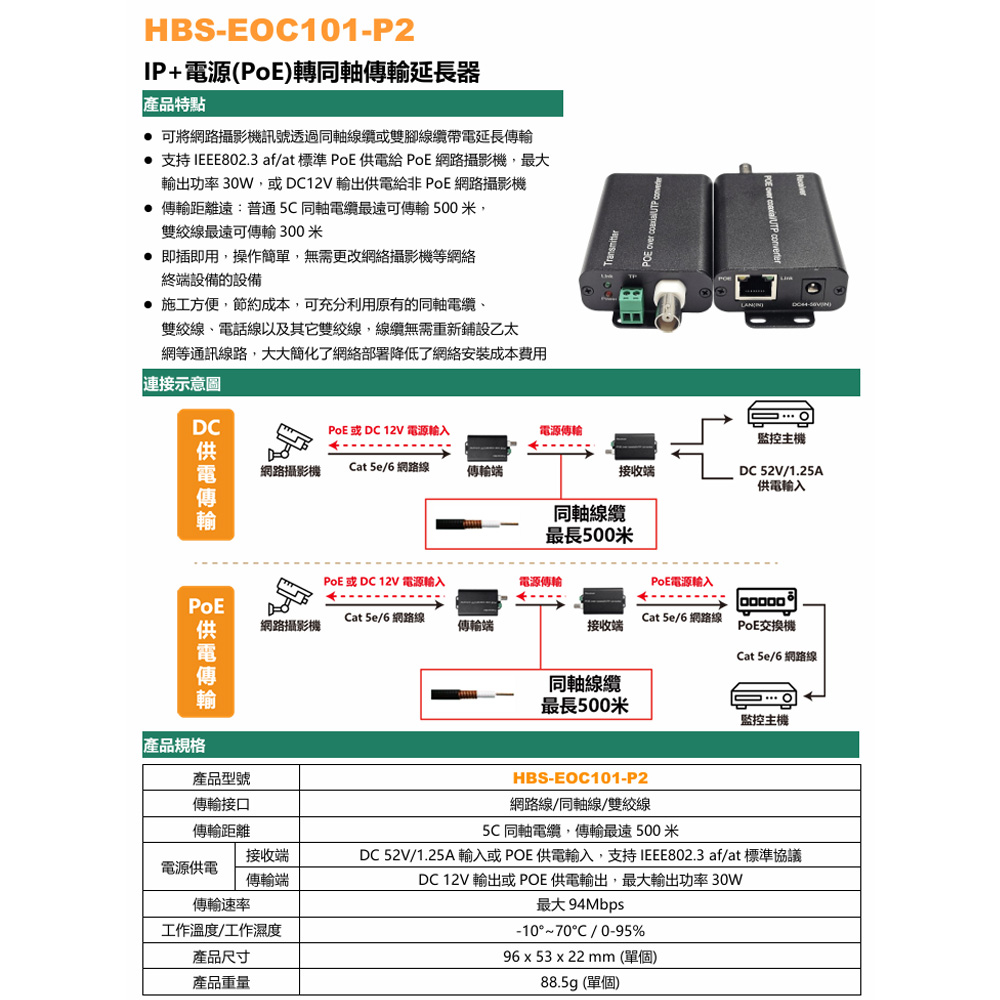 昌運監視器 HBS-EOC101-P2_網路+電源(PoE)轉同軸延長器 500米款