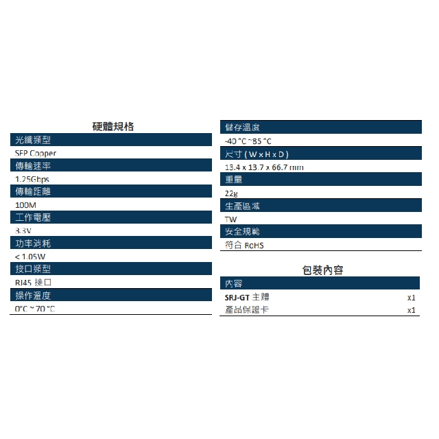 • 支援 IEEE 802.3ab1000BASE-T Gigabit 乙太網路標準規範。• 符合 SFP Multi-Source Agreement (MSA)協議。• 支援 1.25Gbps 超高速乙太網路傳輸能力。• 符合自動偵測速率使用能力並支援網路介面 Auto MDIX 功能,可支援平行線、跳線連接埠,具備 Auto negotiation 自動協議功能。• 在 1.25Gbps 速率下使用 Cat5e 網路線規格,其傳輸距離可達 100 米。• 低功耗小於 1.05W。• 單電源電壓支援 3.3V。• 支援可熱插拔移除再裝入功能。• 支援 RoHS 無鉛材質。• 隨插即用,簡易安裝。