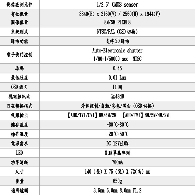 -採高性能圖像傳感器具備 800/500 萬畫素清晰度-內建 8 顆陣列式 LED 燈-日/夜間自動切換-8M AHD/TVI/CVI 【15/12.5 FPS】-5M AHD/TVI 【20/12.5 FPS】-4M AHD/TVI/CVI 【30 FPS】-支援 2D 降噪且優越低照度性能-支持 67 防水等級-內建麥克風收音(選配)-內建 UTC 參數值功能調整