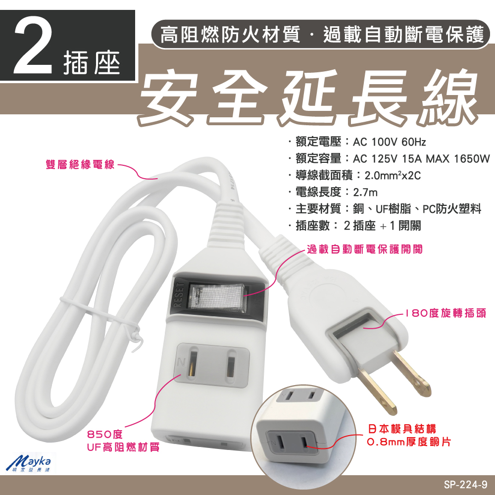 [寶旺旺]明家 2孔1開2插安全延長線9尺 SP-224-9