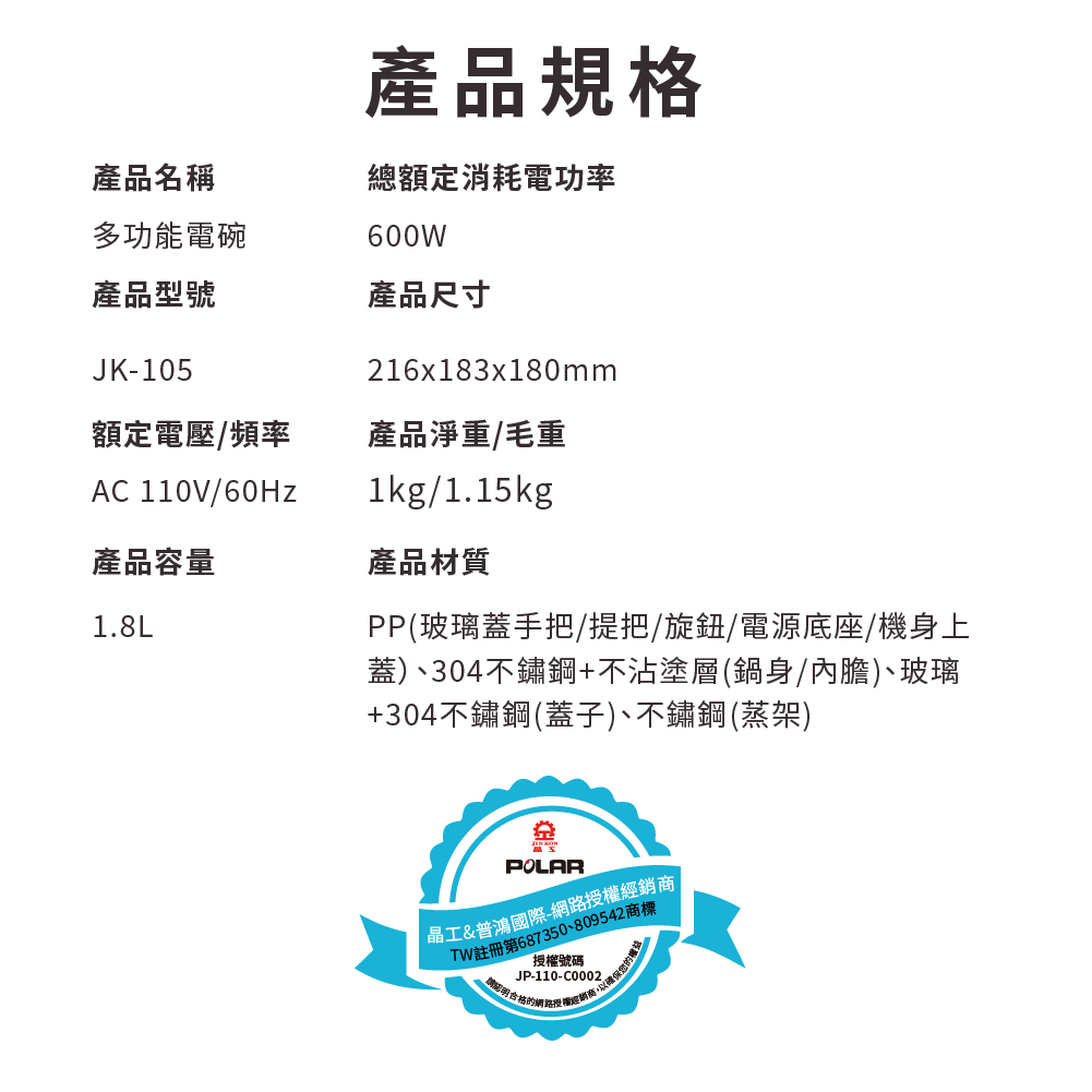 【晶工 Jinkon】1.8L多功能電碗 JK-105