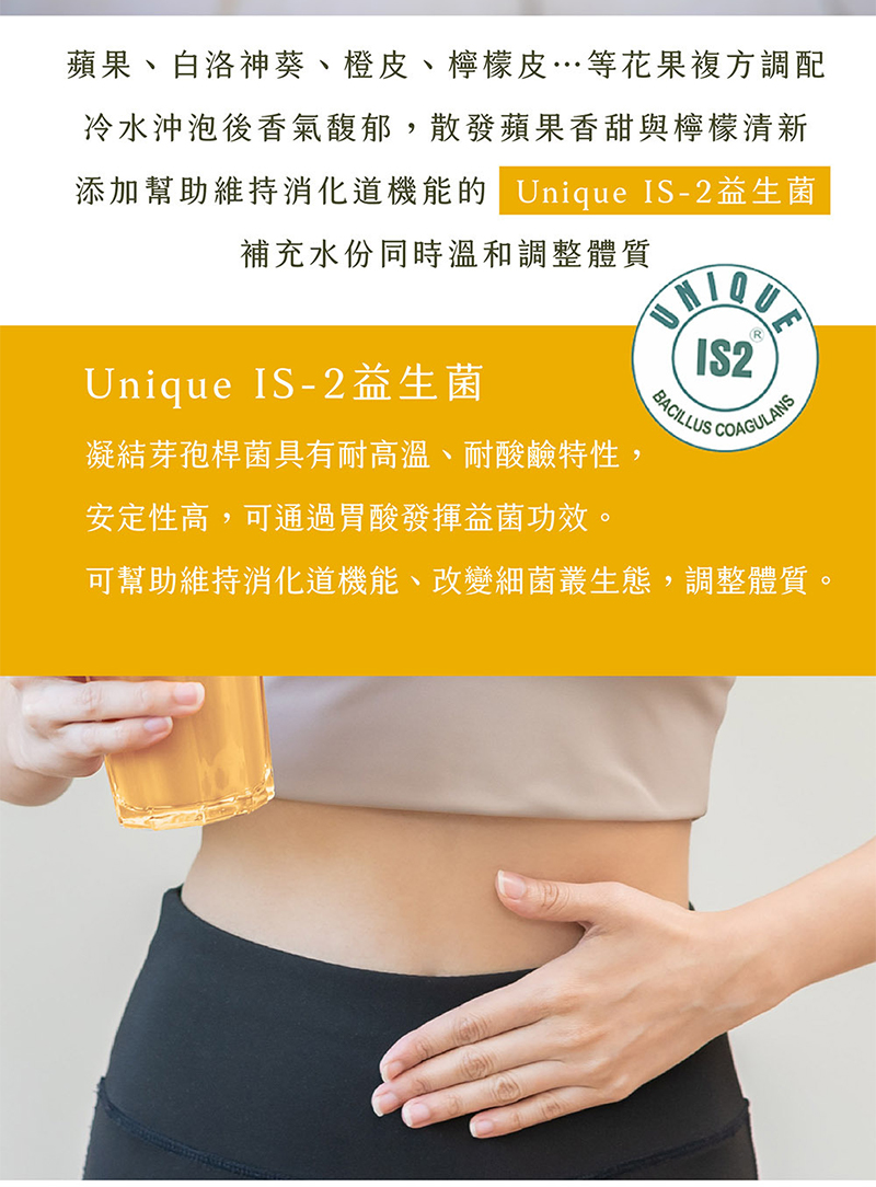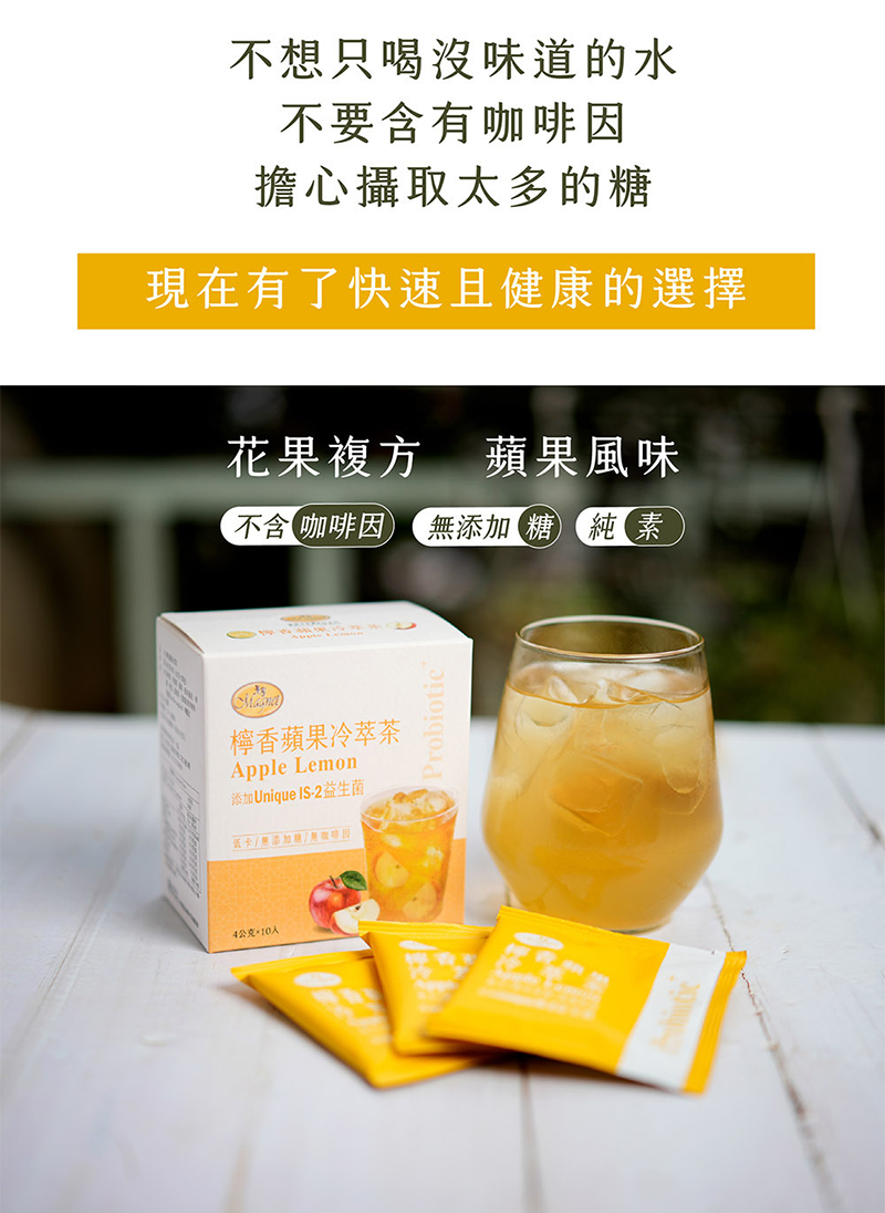 曼寧冷萃機能茶系列,與德國大廠合作研發,以花、草、果等草本複方調配,經水蒸氣滅菌製程,保留花果原味且可安心冷泡。散發蘋果香甜與檸檬清新,口感清爽的檸香蘋果冷萃茶,添加幫助維持消化道機能的Unique IS-2益生菌,補充水份同時溫和調整體質。