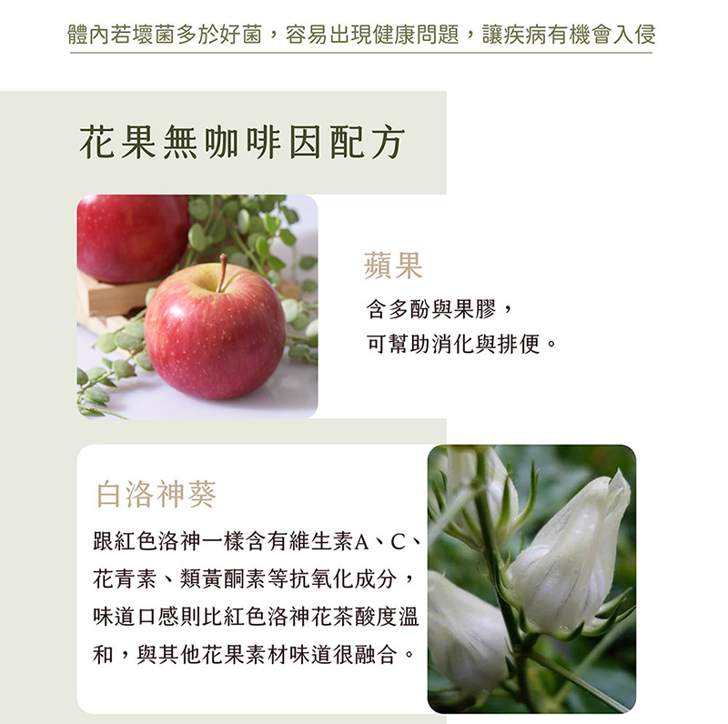 成 份:洛神葵、玫瑰果、蘋果、香料 ( 蘋果、檸檬 )、橙皮、 甜菊葉、乳酸菌(麥芽糊精、乳酸菌 Bacillus coagulans)、 檸檬皮