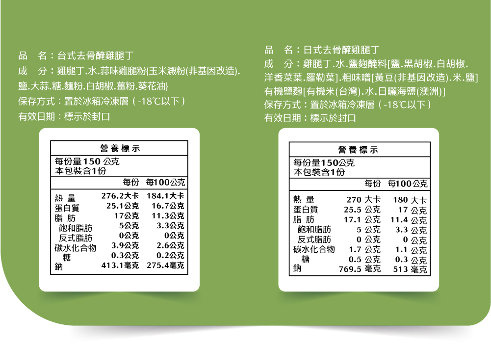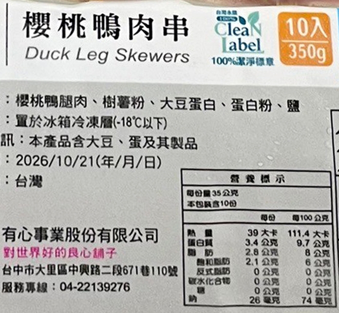有心鴨-櫻桃鴨肉串:櫻桃鴨腿肉、樹薯粉、大豆蛋白、蛋白粉、鹽 台日友好醃雞腿丁組:雞腿丁、水、蒜味雞腿粉{玉米澱粉(非基因改造).鹽.大蒜.糖.麵粉.白胡椒.薑粉.葵花油}/雞腿丁、水、鹽麴醃料{鹽.黑胡椒.白胡椒.洋香菜葉.羅勒葉}、粗味噌{黃豆(非基因改造).米.鹽}、有機鹽麴{有機米(台灣).水.日曬海鹽(澳洲)} 只有-鹽麴味噌五花肉:豬五花(台灣)、水、鹽麴醃料{鹽.黑胡椒.白胡椒.洋香菜葉.羅勒葉}、粗味噌{黃豆(非基因改造).米.鹽}、有機鹽麴{有機米(台灣).水.日曬海鹽(澳洲)} 請氣炸-山賊翅中:雞翅、水、山賊燒醃料{糖.鹽.黑胡椒.大蒜.白胡椒.黑糖(二砂.糖蜜).洋蔥.甜椒.梅精} 只有-豬肉香腸:豬肉(台灣)、豬脂(台灣)、豬腸衣(西班牙)、糖、醬油、鹽、米酒、白胡椒、五香粉、肉桂粉 只有-手撕熟土雞胸:去皮土雞胸肉、水、糖、鹽 冷凍青花菜:青花菜