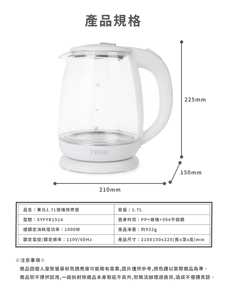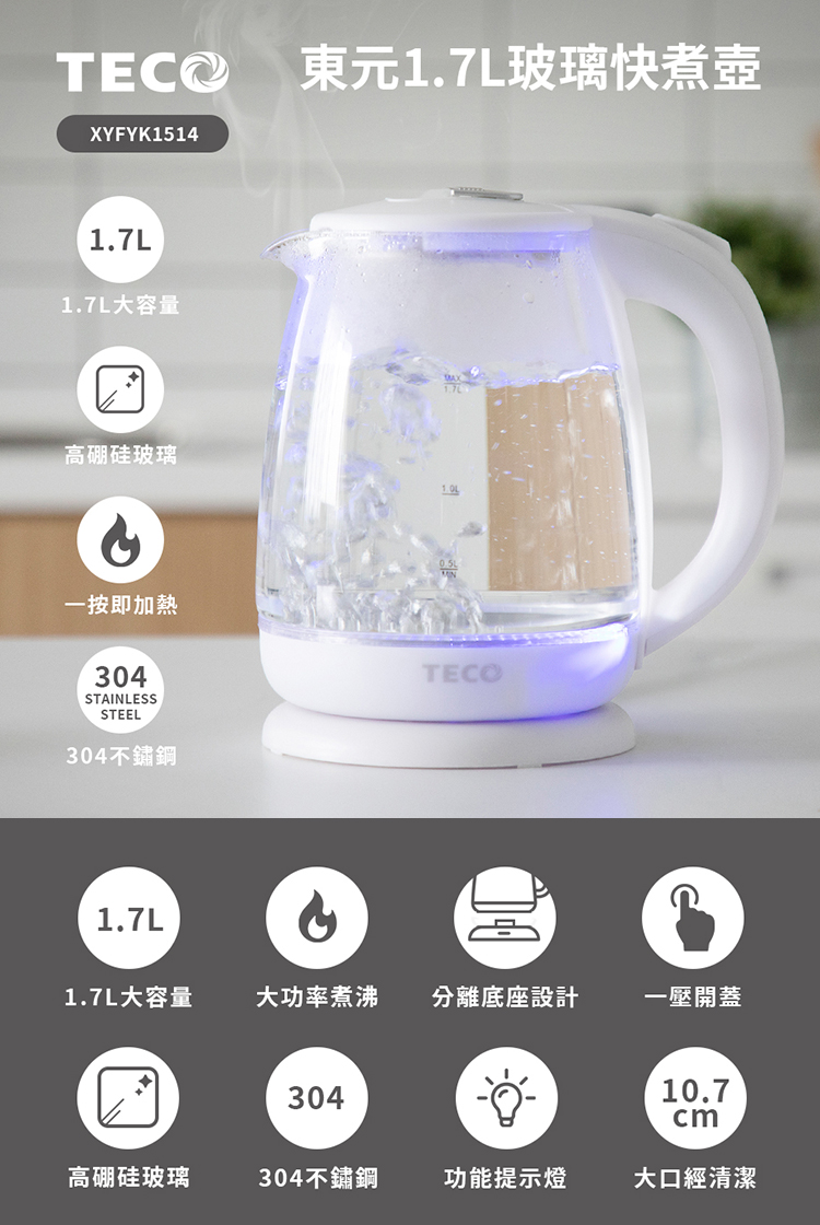 【東元】1.7公升玻璃快煮壺XYFYK1514