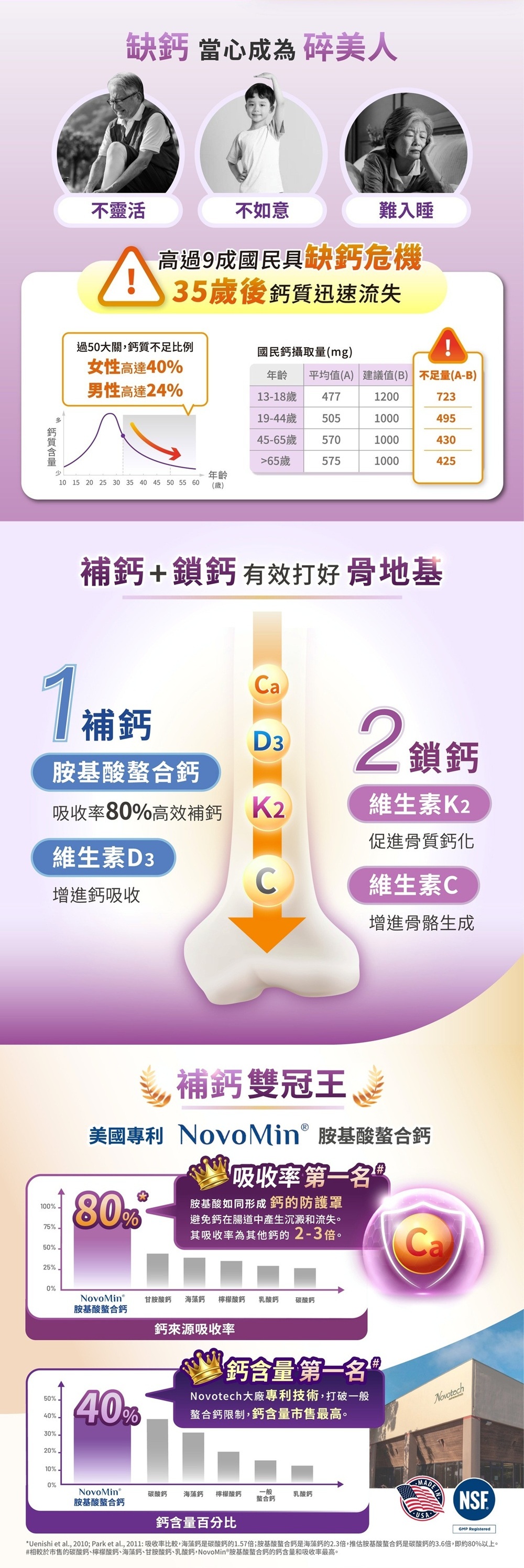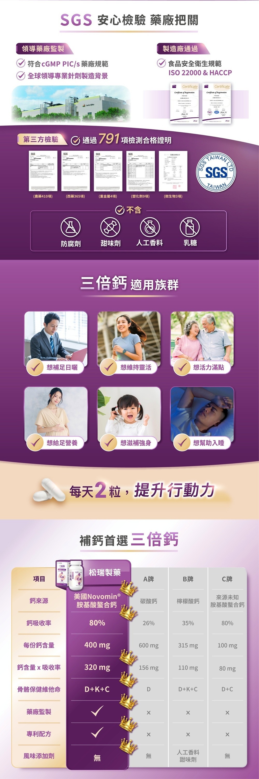 3倍鈣 膠囊 120粒/入.榮獲食品界奧斯卡【Monde Selection世界品質評鑑】金牌獎!.3倍鈣吸收 維持骨骼健康.補鈣|NovoMin®美國胺基酸螯合鈣 + 維生素D3.鎖鈣|維生素K2 + 維生素C.領導藥廠和SGS把關 791項風險物質檢測合格.不含防腐劑、甜味劑、人工香料、乳糖.濃縮高劑量 顆粒小好食用規格說明Q1: 3倍鈣的建議怎麼吃呢?A1:日常保養 2 粒;加強保健 4 粒。多食無益唷!Q2: 3倍鈣膠囊可以打開膠囊食用嗎? A1:不建議唷!膠囊的劑型設計,考量到粉末味道口感不佳會更難嚥口, 且每個人的消化及接受度不盡相同,膠囊也能減緩直接接觸成分產生刺激不適應。Q3: 坊間很多人會推薦海藻鈣、珊瑚鈣,是不是更好呢?A1:重點並非選擇天然鈣或合成鈣,要了解鈣的來源類型,天然鈣若處理不慎,可能增加重金屬及細菌殘留的風險。 海藻鈣、珊瑚鈣成分為碳酸鈣,消化過程易產生不適反應,胺基酸螯合鈣可改善此問題,並提升吸收率,更有效補鈣。Q4: 3倍鈣中的維生素D,是「活性」維生素D嗎?A4:不是!活性維生素D屬於處方用藥,依法不可添加於保健食品中。 飲食中的維生素D2 和 D3 皆屬於非活性維生素D,食用後才會在體內轉變成 活性維生素D。Q5: 如果有服用抗凝血藥物,能夠服用3倍鈣嗎?A5:因為產品中含有維生素K2,會建議先諮詢醫事人員評估唷!