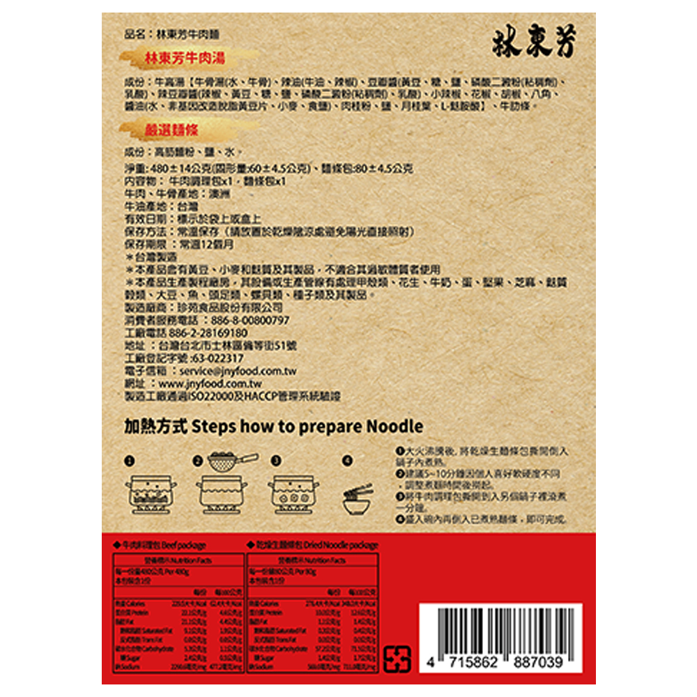 林東芳牛肉湯:牛高湯[牛骨湯(水、牛骨)、辣油(牛油、辣椒)、豆瓣醬(黃豆、糖、鹽、磷酸二澱粉(粘稠劑)、 乳酸)、辣豆瓣醬(辣椒、黃豆、糖、鹽、磷酸二澱粉(粘稠劑)、乳酸)、小辣椒、花椒、胡椒、八角、 醬油(水、非基因改造脫脂黃豆片、小麥、食鹽)、肉桂粉、鹽、月桂葉、L-麩胺酸]、牛助條。 嚴選麵條:高筋麵粉、鹽、水。