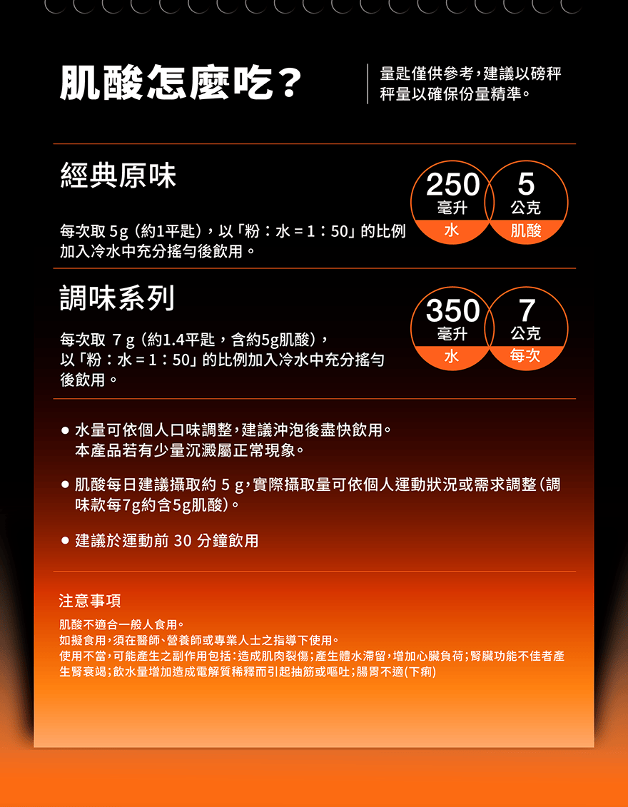Creatine 微粉化肌酸【冰糖雪梨】420g - 果果能量 GOpower【品名】:微粉化肌酸-冰糖雪梨【淨重】:420克【保存期限】:2年【產地】:臺灣【建議食用方式】:➤ 經典原味:每次取 5g(約 1 平匙),以「粉:水 = 1:50」的比例加入冷水中充分搖勻後飲用。➤ 調味系列:每次取 7g(約 1.4 平匙,含約 5g 肌酸),以「粉:水 = 1:50」的比例加入冷水中充分搖勻後飲用。● 量匙僅供參考,建議以磅秤秤量以確保份量精準。● 水量可依個人口味調整,建議沖泡後盡快飲用。本產品若有少量沉澱屬正常現象。● 肌酸每日建議攝取約 5g,實際攝取量可依個人運動狀況或需求調整(調味款每 7g 約含 5g 肌酸)。● 建議於運動前 30 分鐘飲用酸酸甜甜的莓果口味,是清新的夏日回憶,可加入水中飲用或與其他飲品一同調配使用,清爽口味豐富你的訓練時刻果果能量微粉化肌酸產品特色:1. 零禁藥檢出:通過運動禁藥檢測,敬請放心補充,陪伴你面對各種挑戰。 2. 微粉化技術:果果能量微粉化肌酸經過特殊處理,顆粒極細、遇水快速分散。 3. 素食可食用:本產品以水合技術製作,不含動物性來源,純素者可安心食用。 除了經典原味可以自行調飲外,獨家推出調味款肌酸,每次補充都像在喝飲料,豐富你的訓練日常。 肌酸是什麼? Creatine 肌酸是由精胺酸、甘胺酸和甲硫胺酸等三種胺基酸組合而成的天然化合物。 肌酸的最佳使用時機是什麼時候? 1. 訓練前 30 分鐘是使用肌酸的最佳時機 2. 也可以在訓練後飲用肌酸,並可搭配乳清蛋白 使用肌酸有沒有哪些注意事項? 1. 建議依照循環週期補充 2. 使用肌酸時應增加水分攝取,避免脫水 3. 建議與碳水化合物及蛋白質一同使用 *肌酸不適合一般人食用。如擬食用,須在醫師、營養師或專業人士之指導下使用。使用不當,可能產生之副作用包括:造成肌肉裂傷;產生體水滯留,增加心臟負荷;腎臟功能不佳者產生腎衰竭;飲水量增加造成電解質稀釋而引起抽筋或嘔吐;腸胃不適(下痢)*本產品已投保產物產品責任險一千萬元,投保金額非為理賠金額
