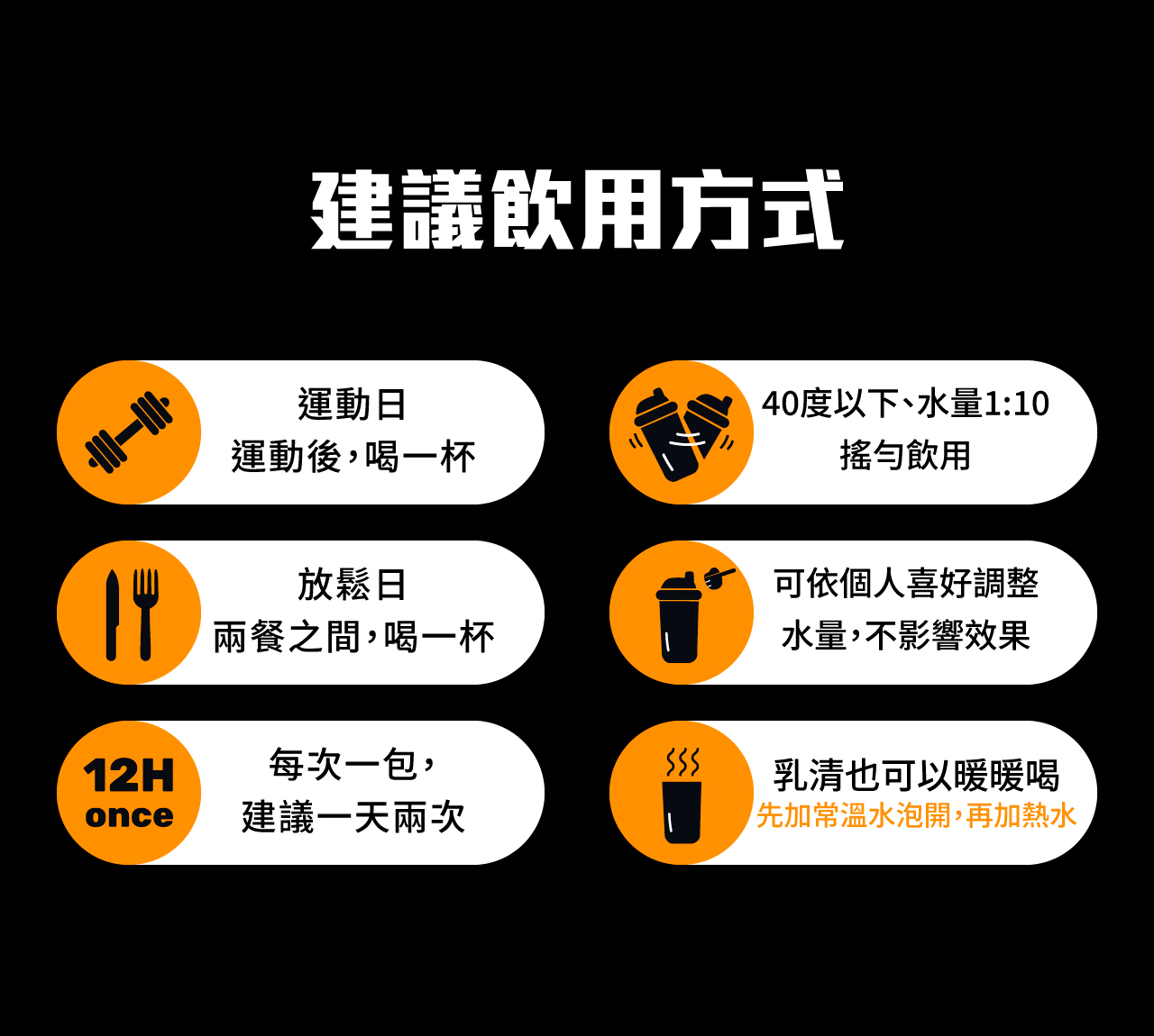 以40度以下常溫水,以1:10的水量比例搖勻飲用。可依個人喜好調整水量或加入冰塊,不影響蛋白質攝取量和效果。沖泡乳清時建議水溫不要超過60度,溫度過高會使蛋白質變性而影響口感,想要溫熱喝可以先以一半的常溫水泡開乳清後再酌量加入溫熱水,整體溫度不要超過60度。