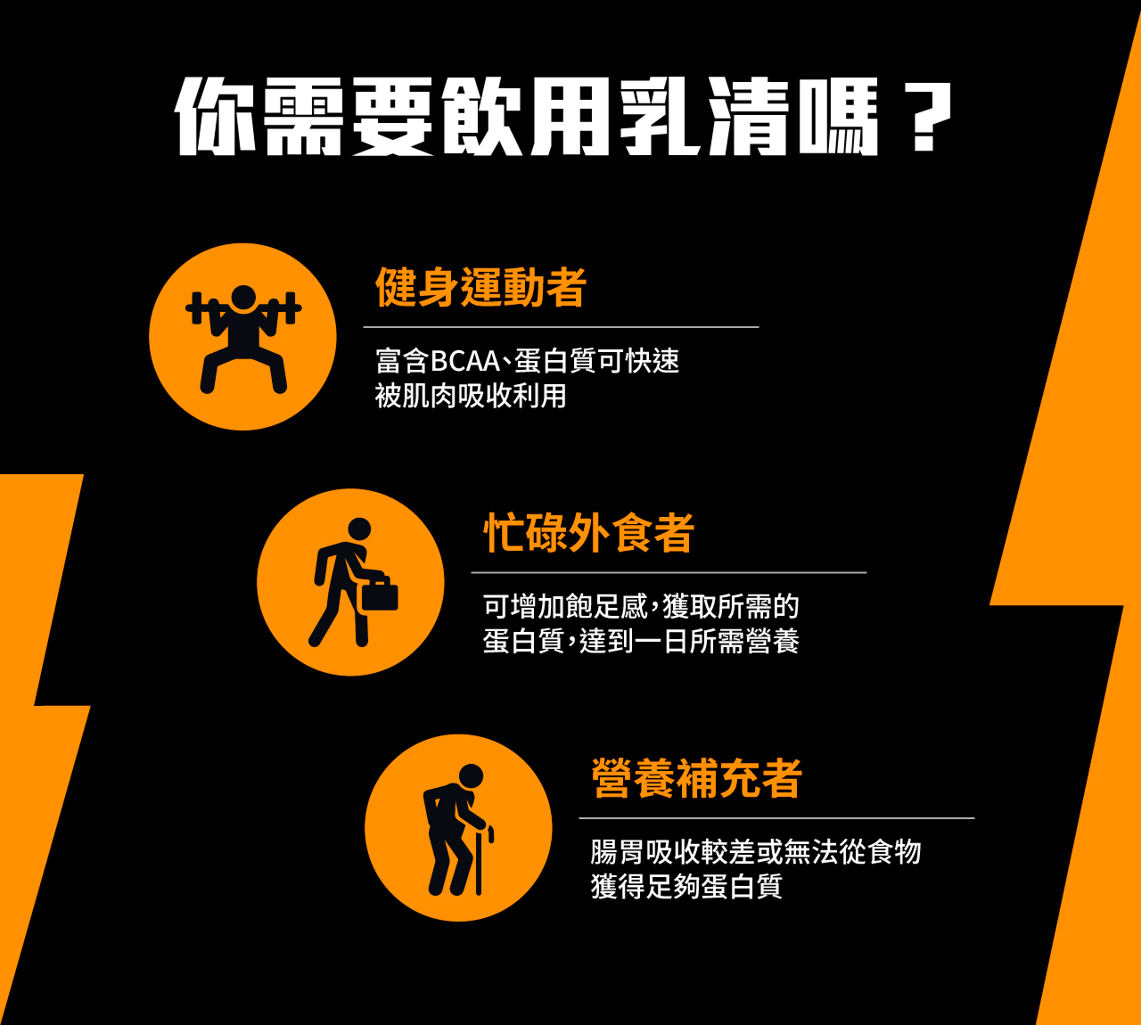 - 忙碌外食者:可透過飲用乳清蛋白攝取蛋白質