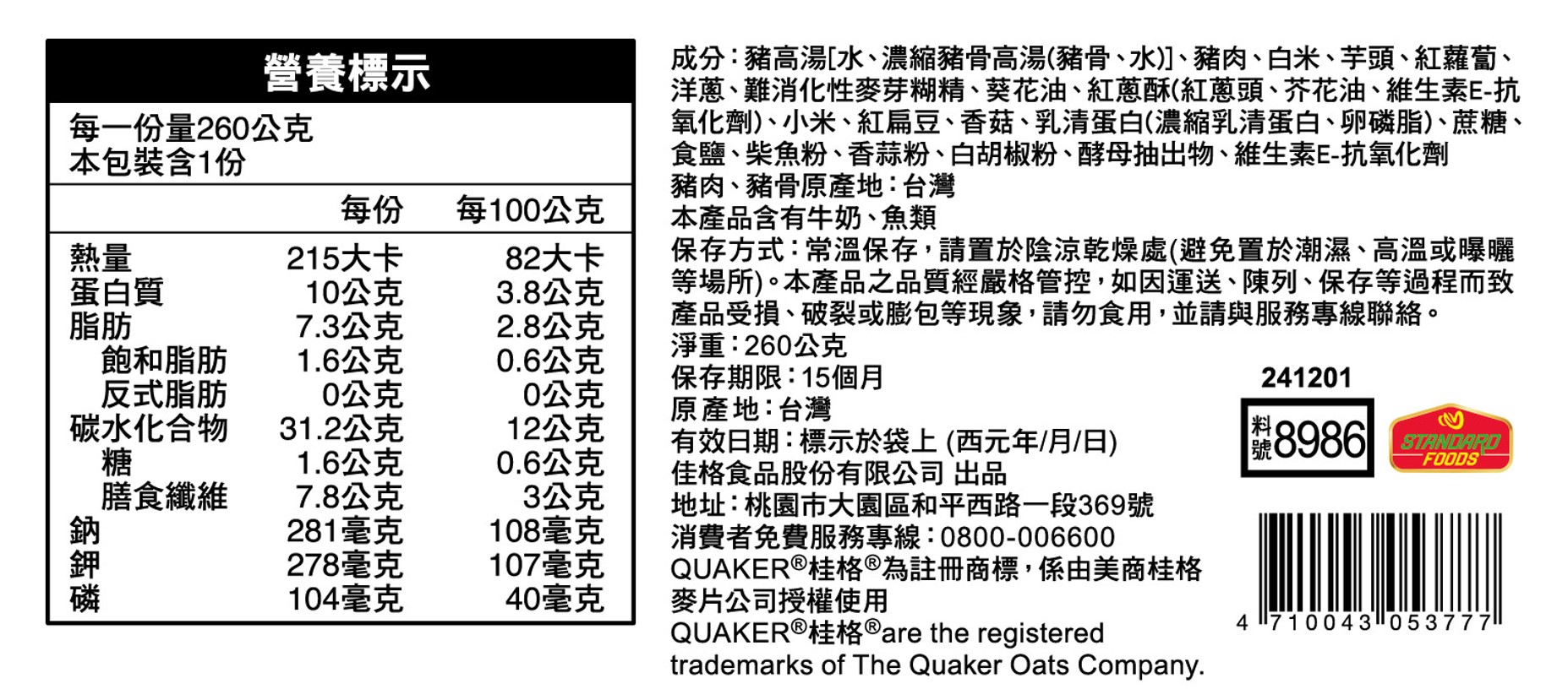 ◎品牌:桂格完膳 ◎規格: 260g克 x 1 x 1Bag包