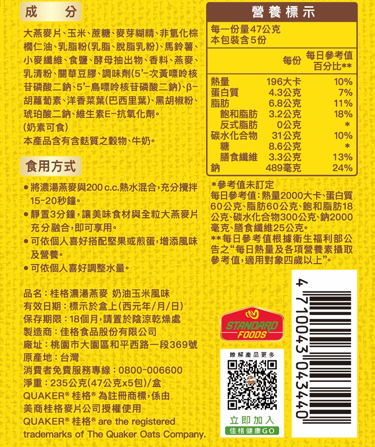 桂格濃湯燕麥-奶油玉米風味-47gx5
