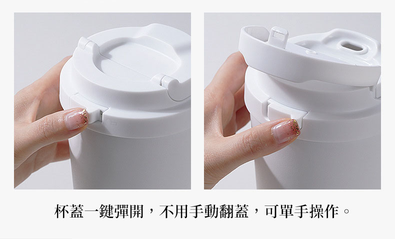 ◆一鍵式彈開杯蓋: 獨特的一鍵開啟設計,單手輕鬆操作,方便快捷,讓您在繁忙的上班日常中省卻瑣碎步驟。