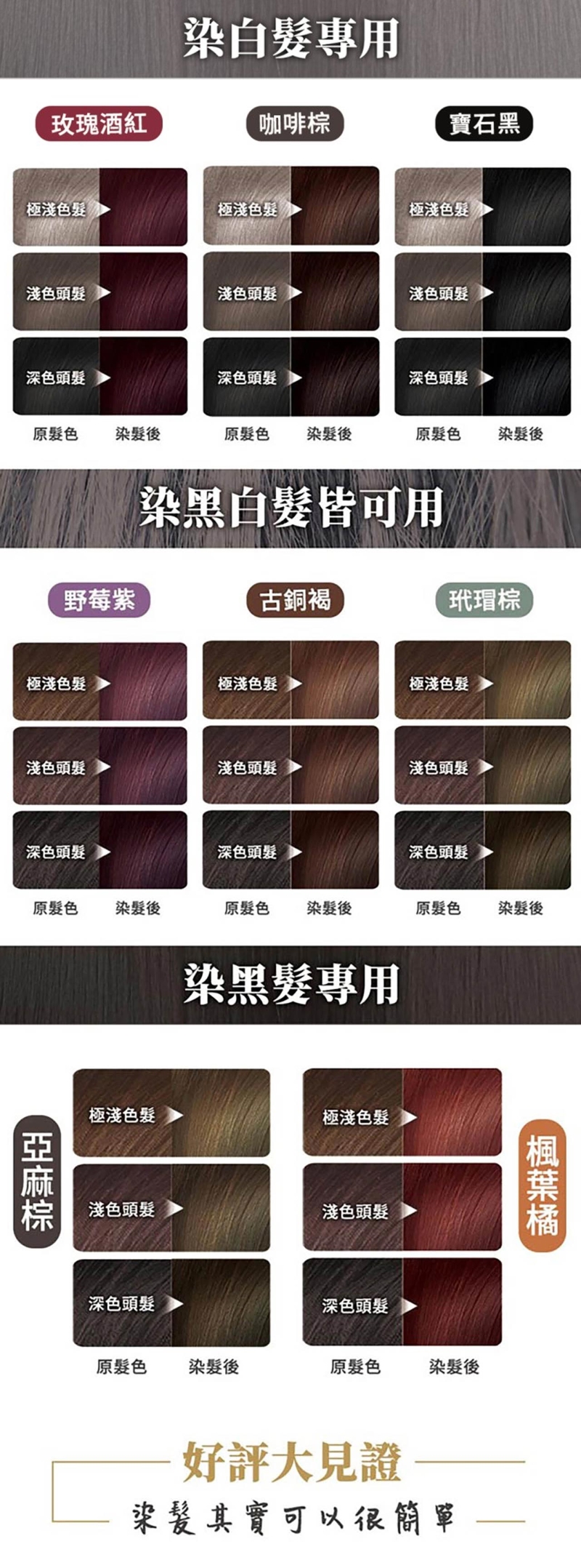 拒當「白髮魔女」,想要養髮可以這樣做添加植物菁華,保護頭皮,染後無刺鼻味,髮絲飄香容量:第一劑40ml / 第二劑40ml