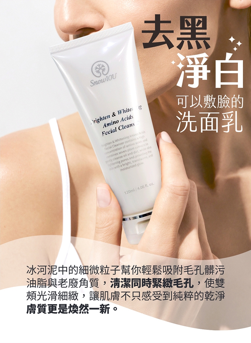 以高濃度胺基酸,結合專利美白成分,溫和洗淨油脂髒污,同時緊緻毛孔,提供肌膚淨白透亮光潤感。