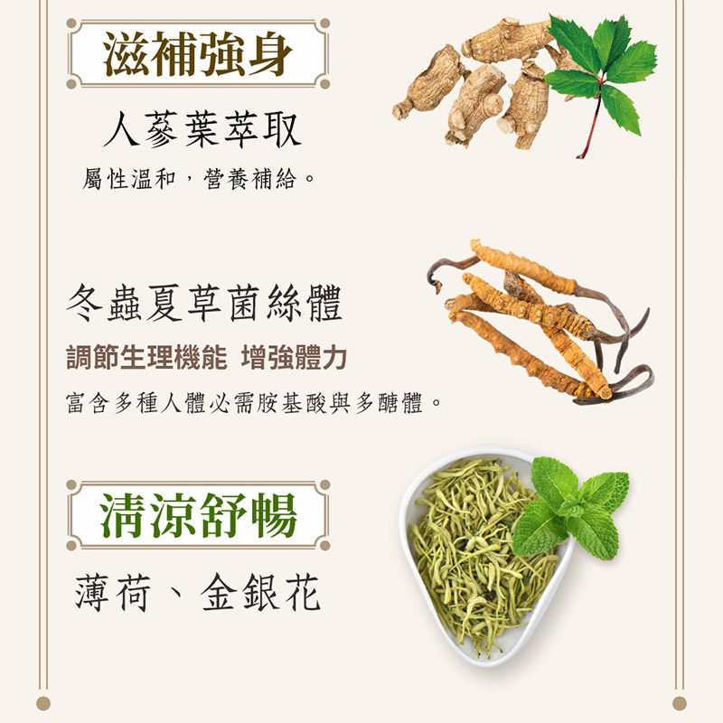 【營養補給】人蔘葉萃取、冬蟲夏草菌絲體、金銀花萃取