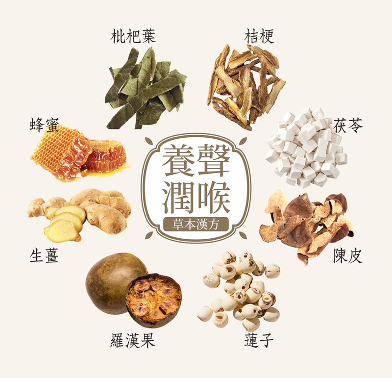 砂糖、麥芽糖、椰子油、明膠、植物萃取物(枇杷葉、桔梗、茯苓、陳皮、蓮子、羅漢果、生薑)、蜂蜜、療肺草萃取粉(療肺草萃取粉、麥芽糊精)、冬蟲夏草菌絲體(中華被毛孢.Hirsutellasinensismycelia,液態態培養)、蜂膠萃取粉(乳糖、柑橘生物類黃酮、蜂膠萃取液)、金銀花萃取粉、人參葉萃取粉(人參葉萃取粉、麥芽糊精)、香料、焦糖色素、薄荷腦、棕櫚蠟(食品製造用劑)。